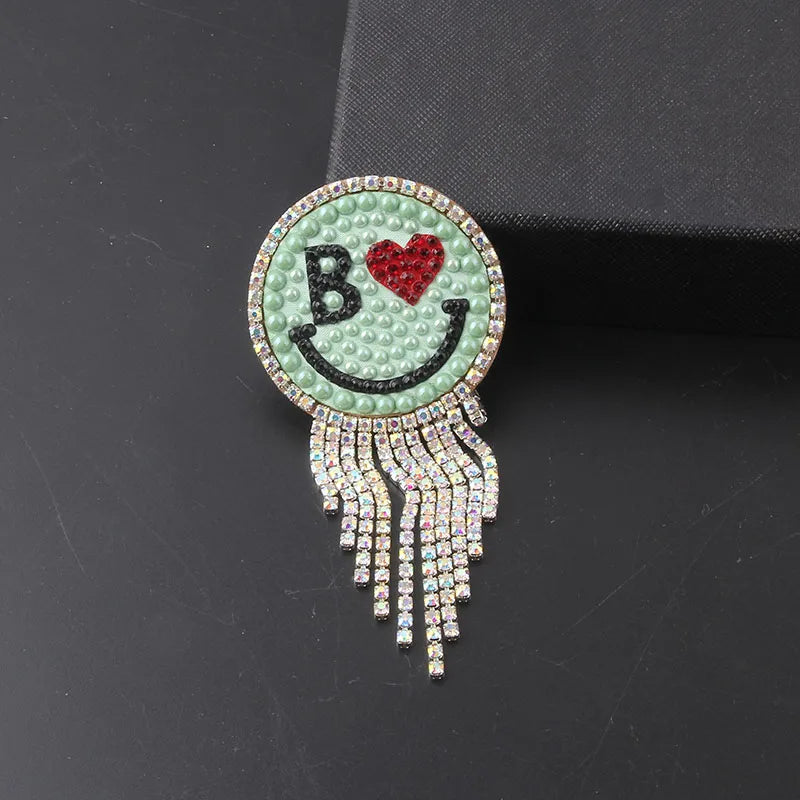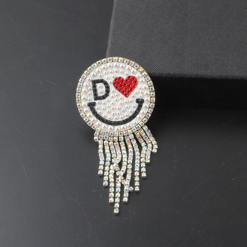 Add a touch of glam to any outfit with this cute smiley face brooch featuring rhinestones and a playful tassel. Perfect for a street-style look or as a fun gift for a friend.
