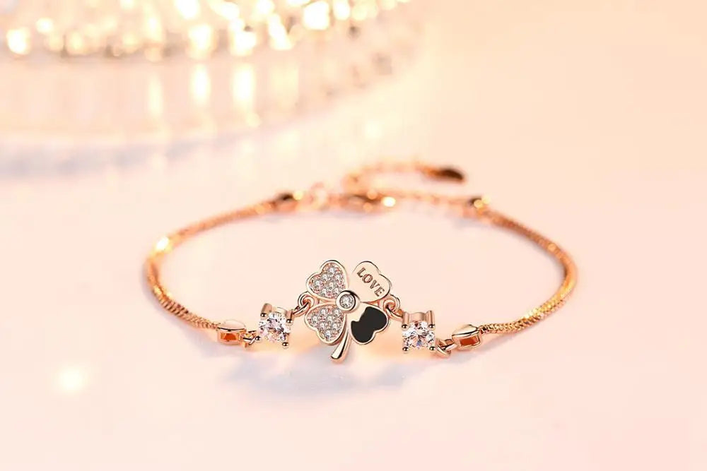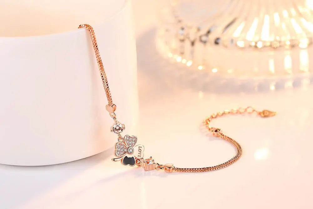 Delicate and charming four leaf flower bracelet crafted from 925 sterling silver with sparkling micro CZ zirconia stones. Perfect gift for women and girls.