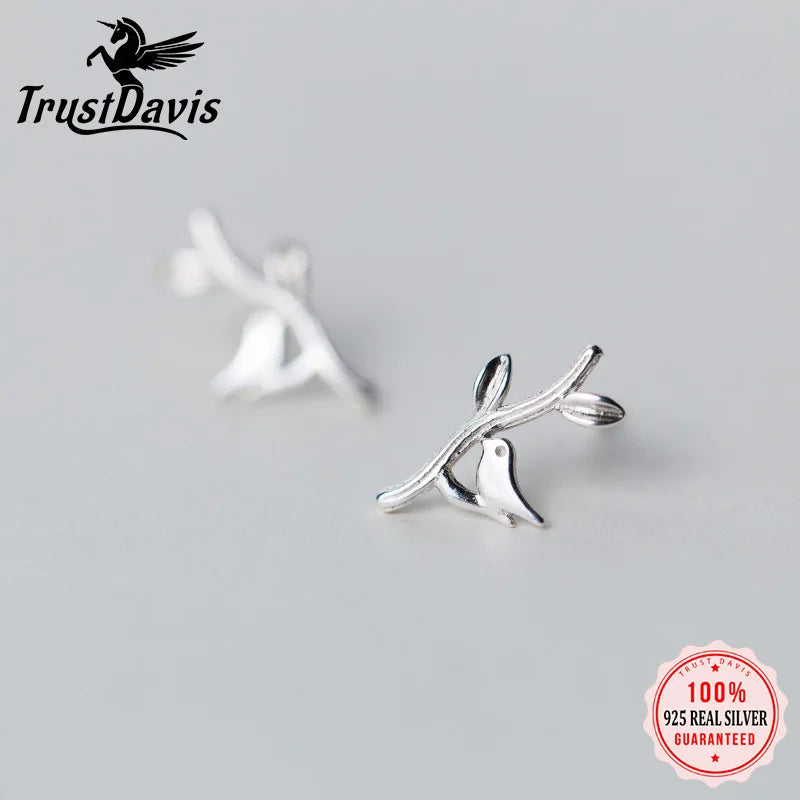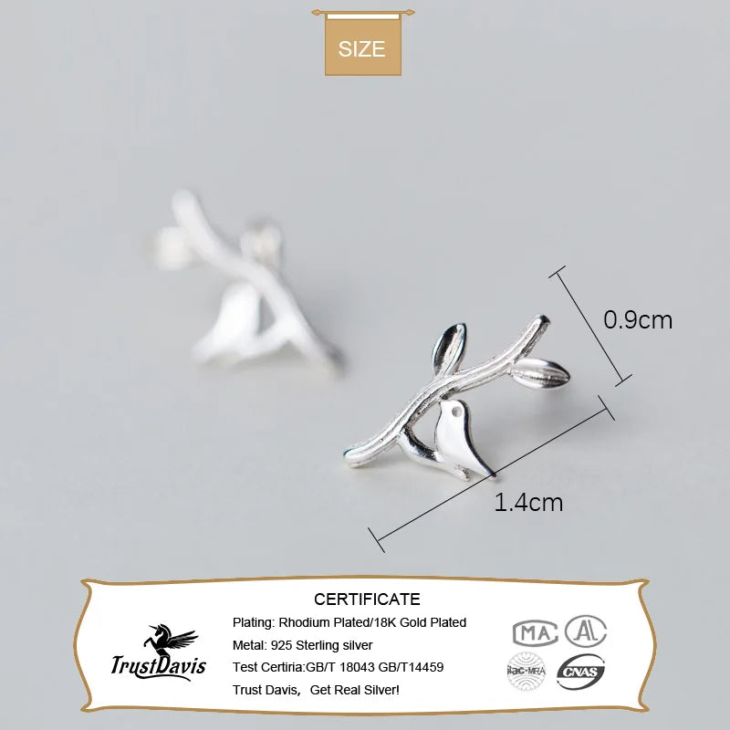 925 Silver Kids Earring Leaves Bird Stud Earrings For Girls Fine Gift DS428