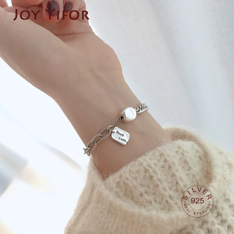 This exquisite party bracelet is made of 925 sterling silver with a vintage lucky English letter tag design. Perfect hand jewelry for women to add a touch of elegance to any outfit.