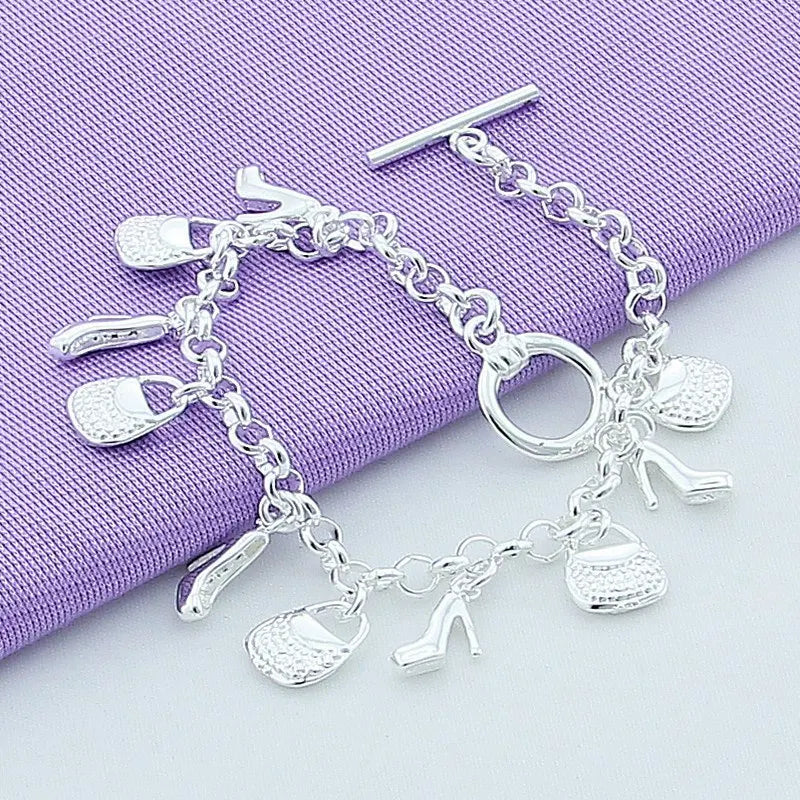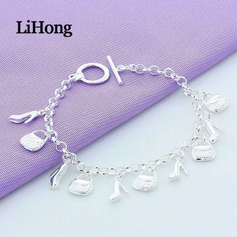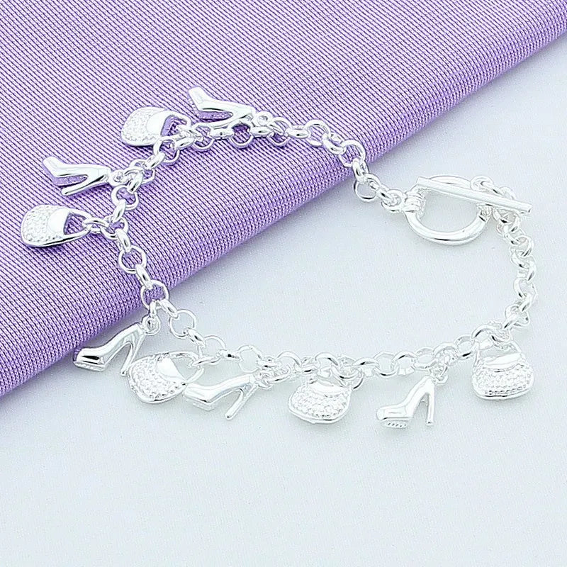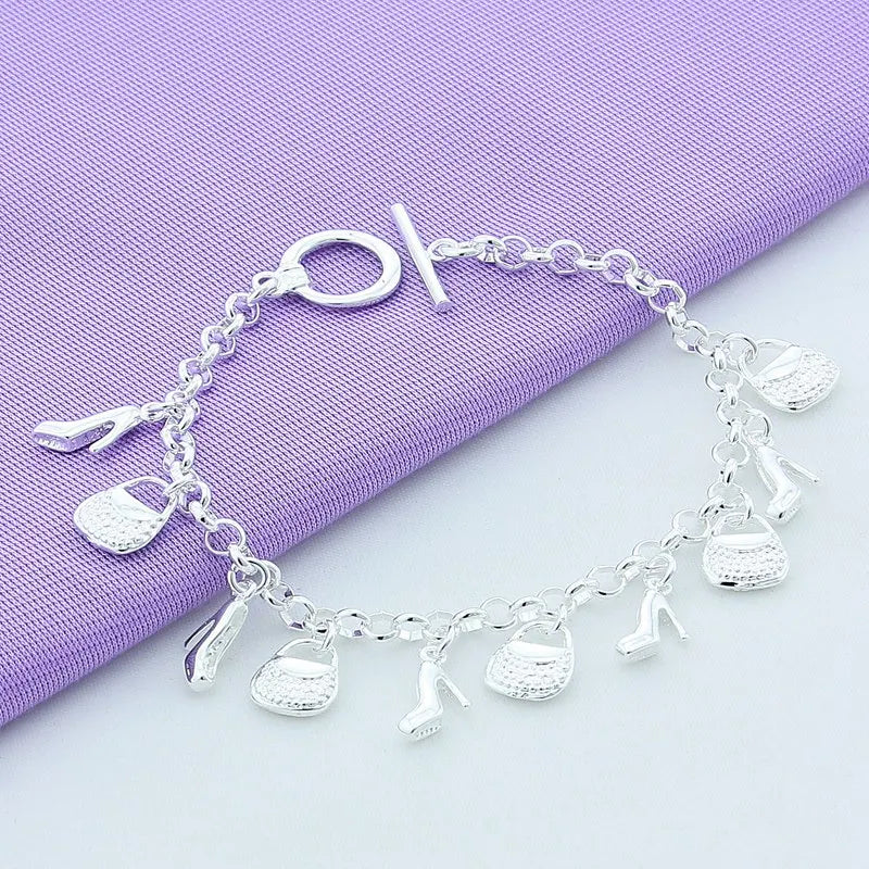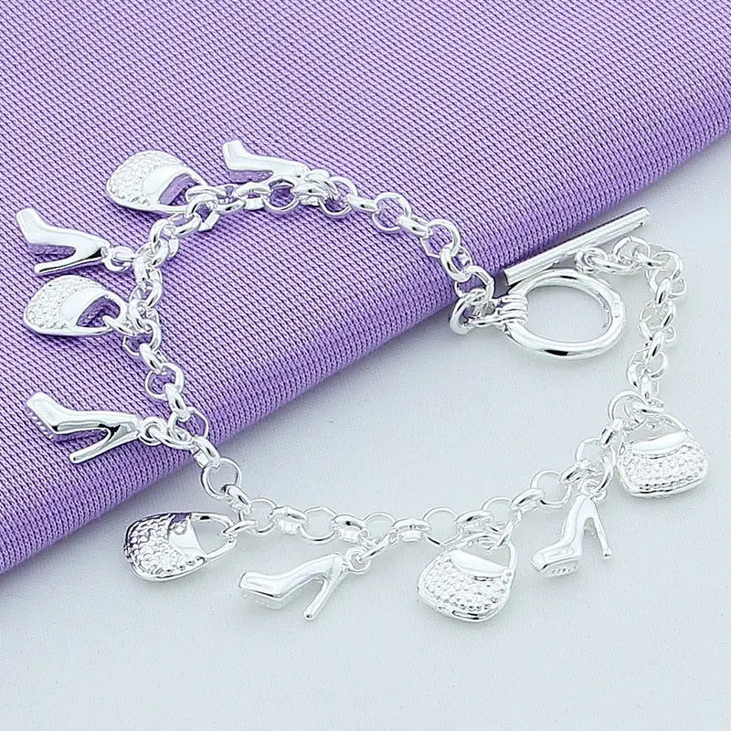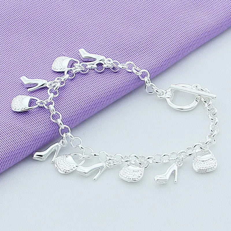 925 Sterling Silver Bracelet Shoe Bag Pendant Woman Charm Jewelry