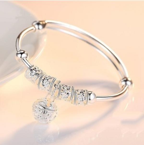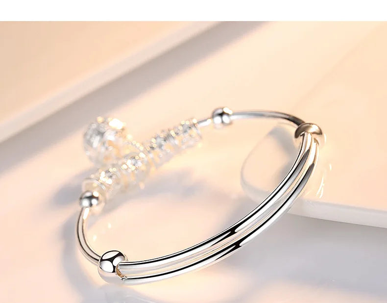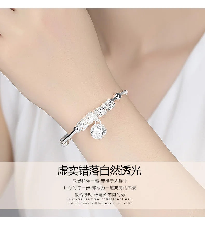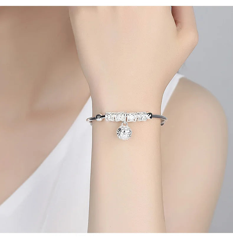 This beautiful bangle cuff bracelet is made of high-quality 925 sterling silver with charming stone accents. It features ball and bell pendants for added elegance.