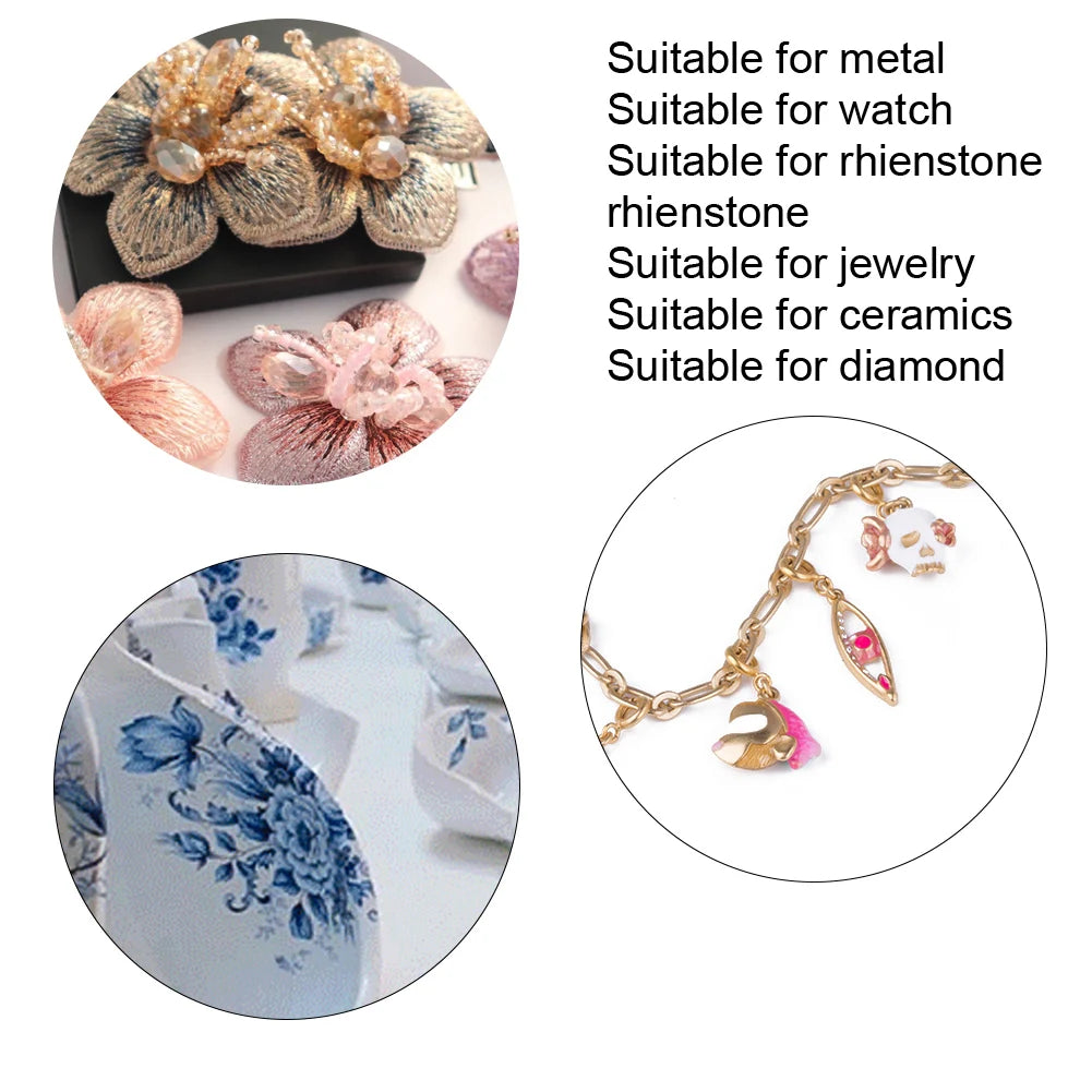 This 9ML transparent adhesive glue is perfect for fixing rhinestones on watches, jewelry, hardware, and glass. It dries quickly and securely.
