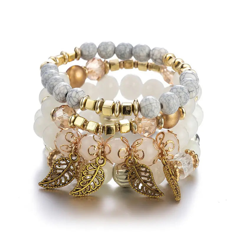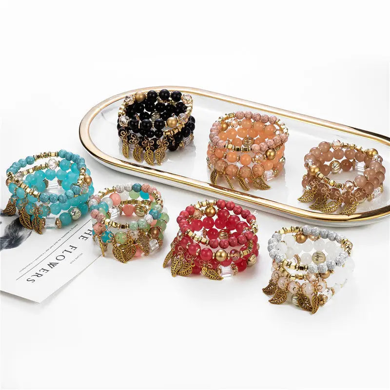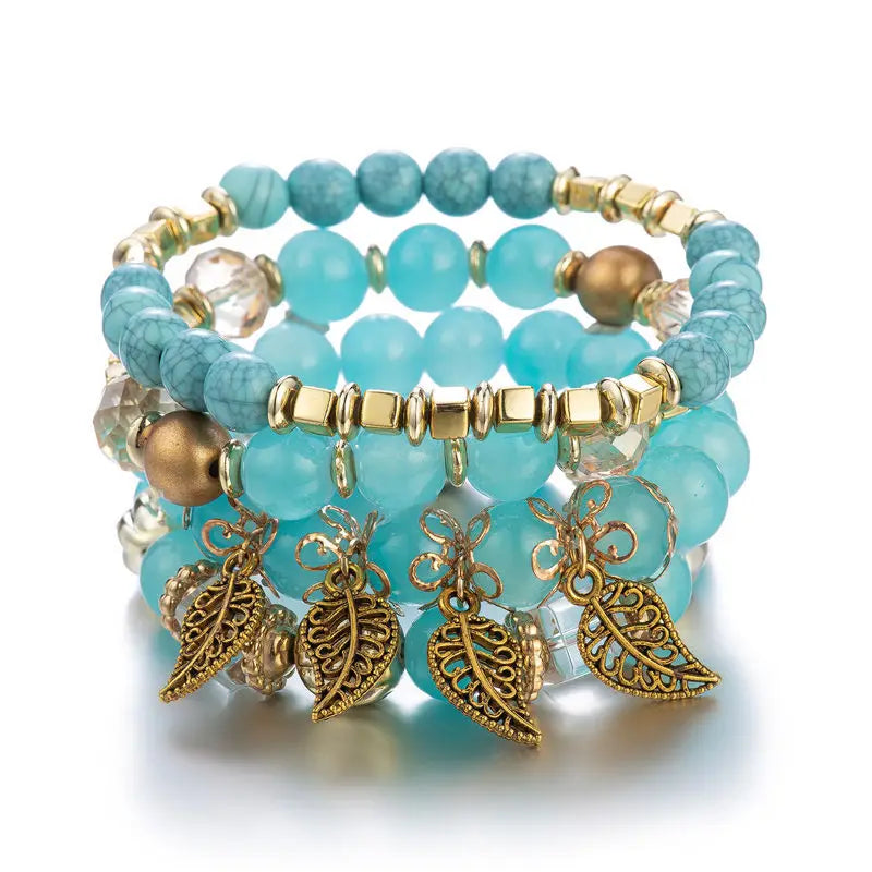 Enhance your style with this bohemian multilayer glass bead bracelet adorned with leaf charms. Perfect for women who love unique jewelry pieces.