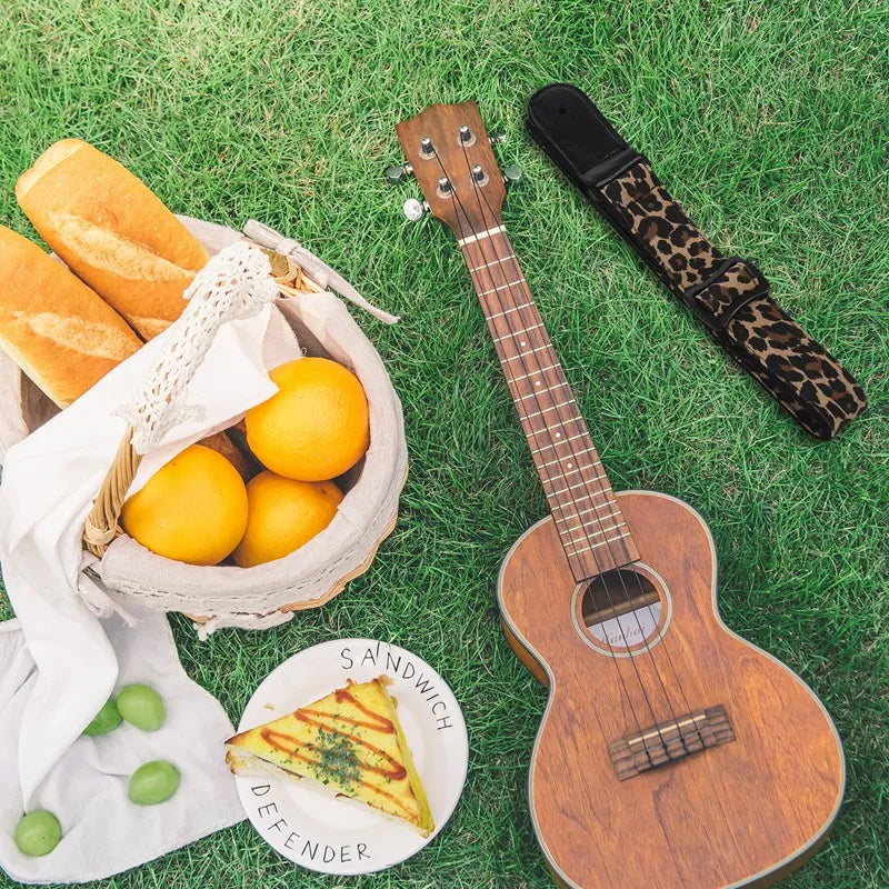 Add some fun to your guitar playing with this cartoon-inspired adjustable guitar strap featuring a yellow leopard print design on denim. Made with high-quality leather ends for durability and comfort.