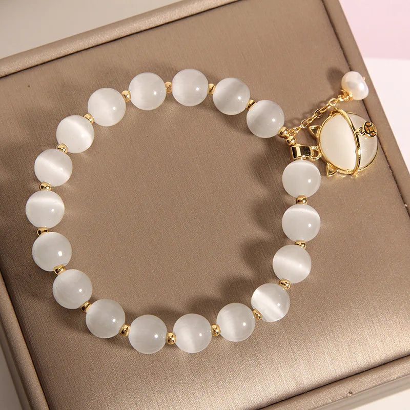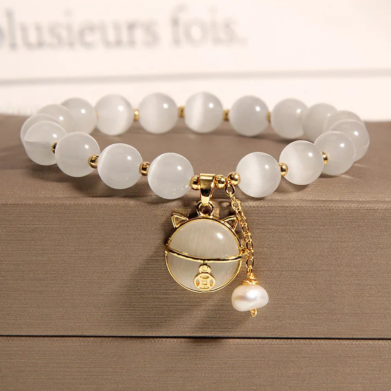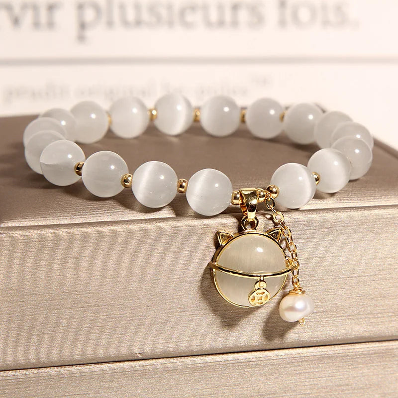 Elegant bracelet featuring cat's eye crystals and freshwater pearls, perfect for adding a touch of sophistication to any outfit.