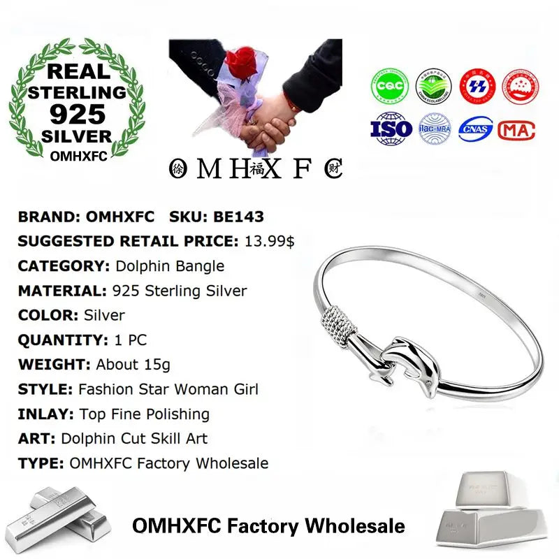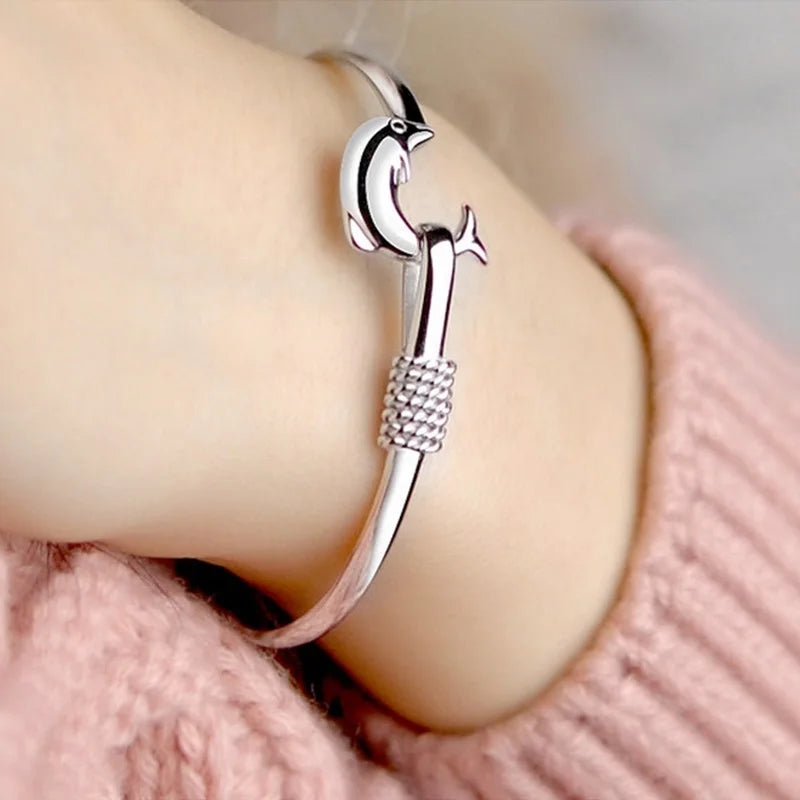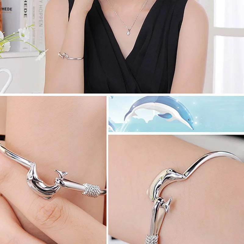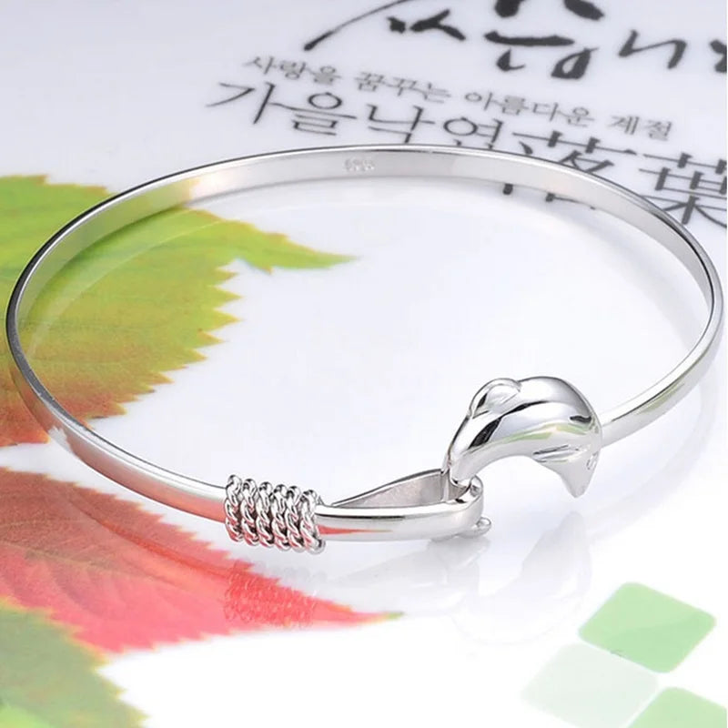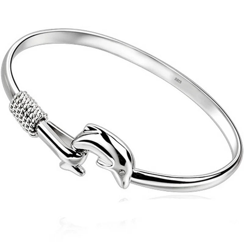 This stunning 925 sterling silver bangle bracelet features a dolphin design that is perfect for parties, birthdays, weddings, or as a gift. The elegant and stylish design will complement any outfit.
