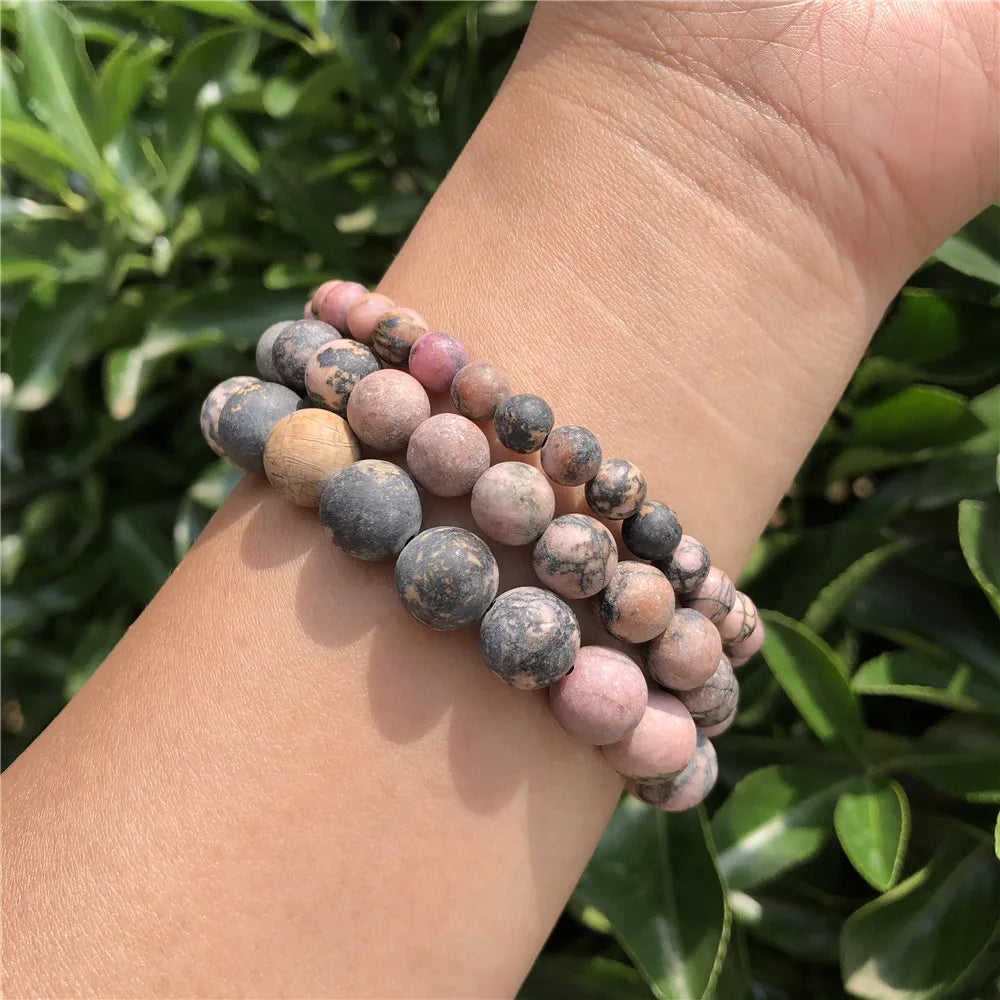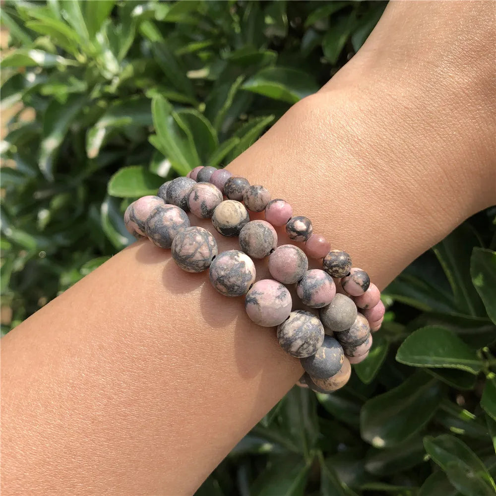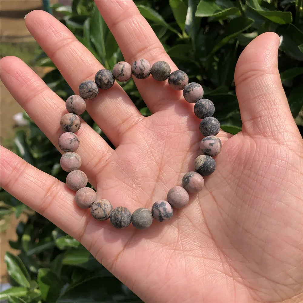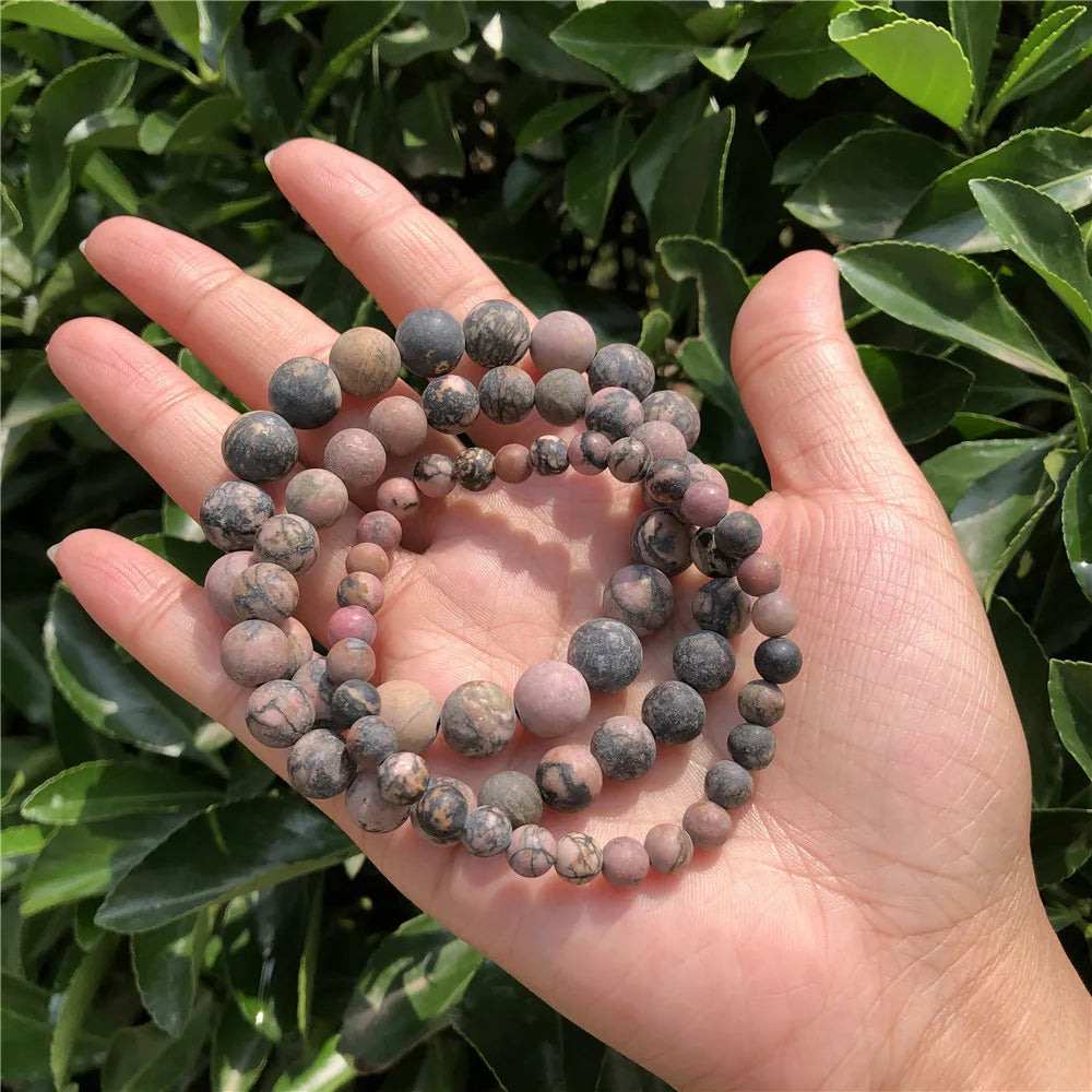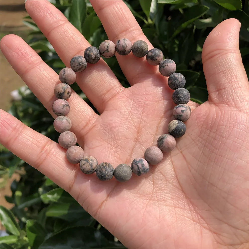 This Fengbaowu bracelet features natural matte rhodonite round beads, perfect for both women and men. Ideal for crystal healing and can be a thoughtful gift for any occasion.