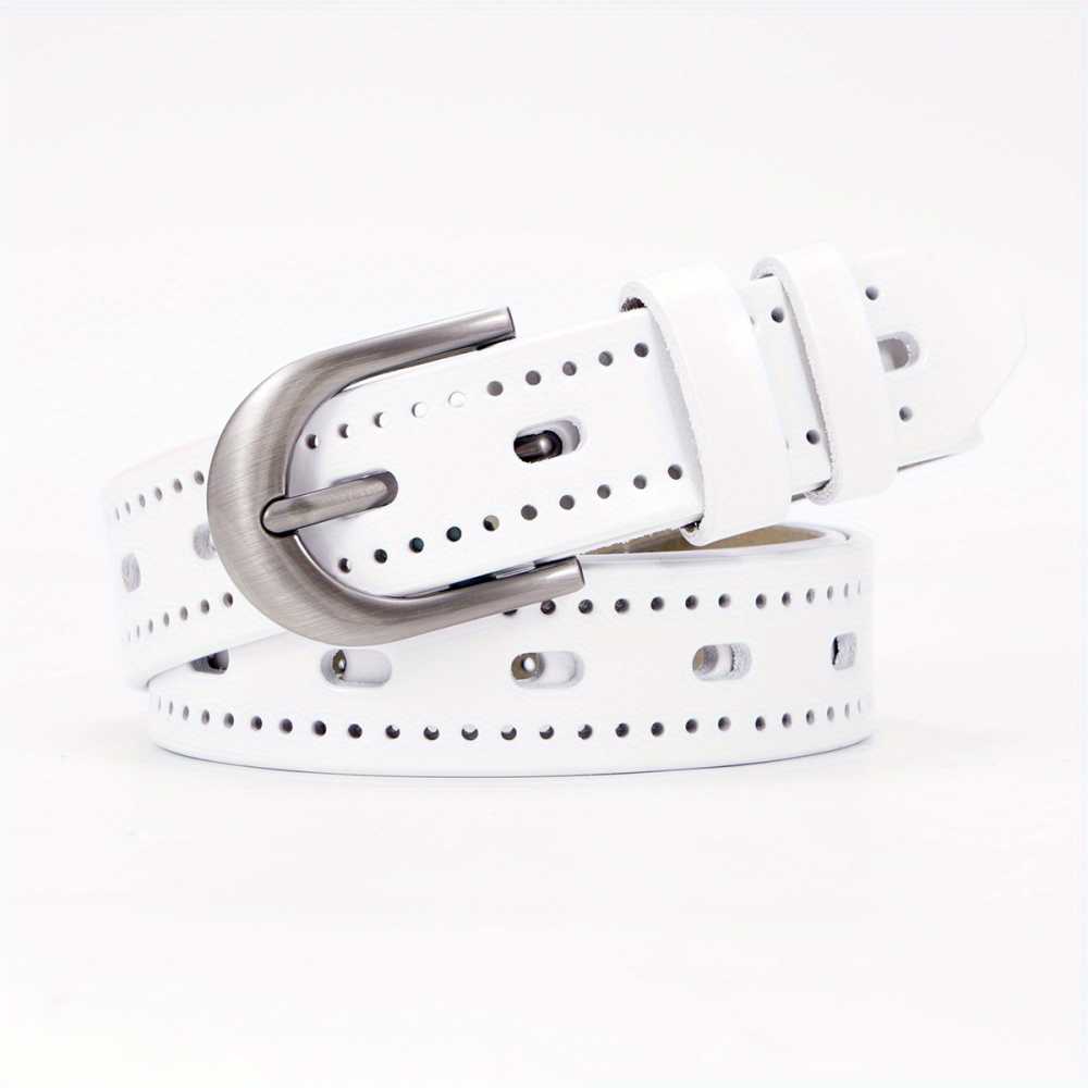 - Product Particulars: This Genuine Leather Simple Belt features a solid color design with a stylish hollow pattern. It is equipped with an elegant oval pin buckle for easy wear. Crafted from high quality leather.