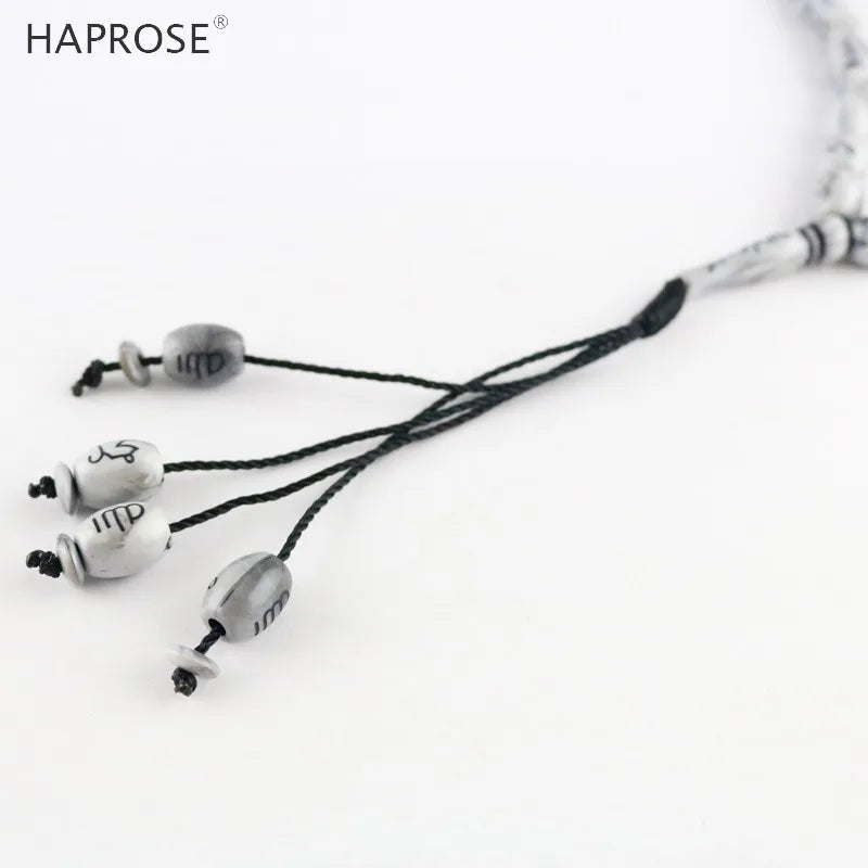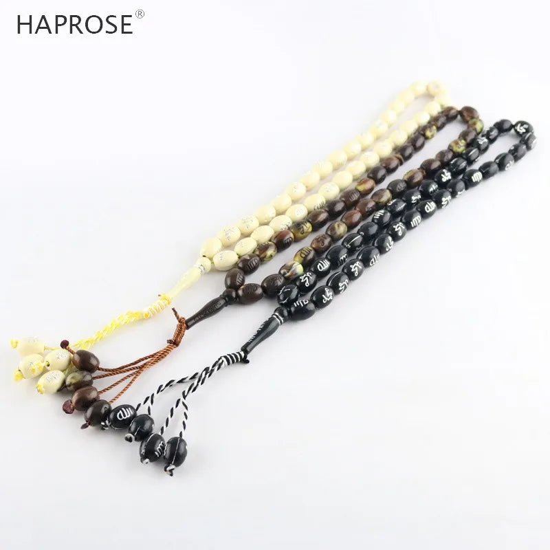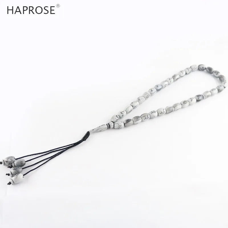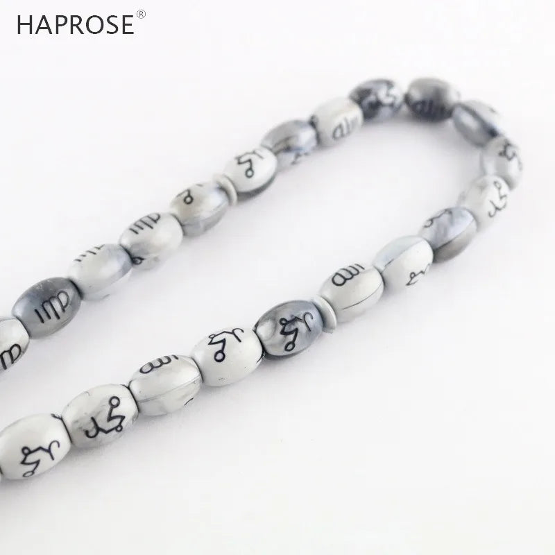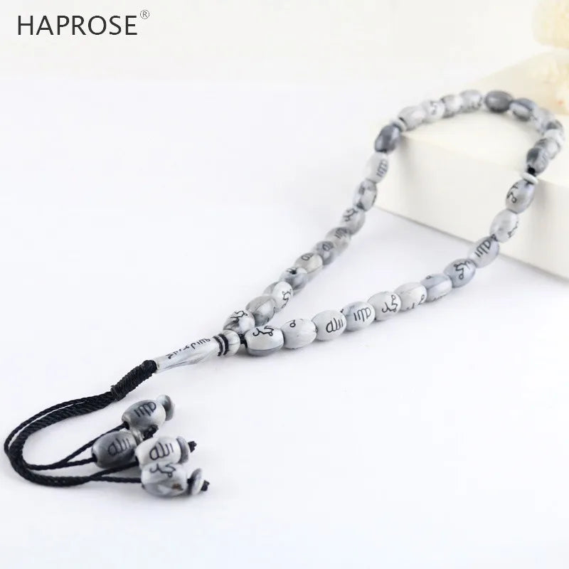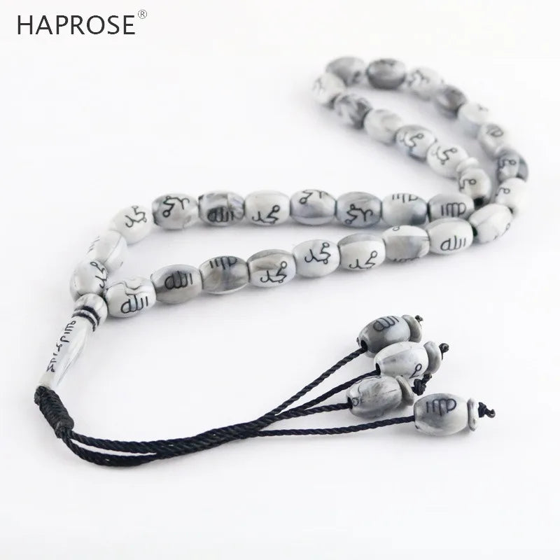 This hand bracelet features 33 gray beads with Allah sculpting text, perfect for Muslim and Islam followers. Show your faith with this unique accessory.