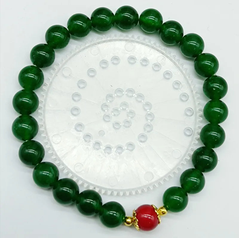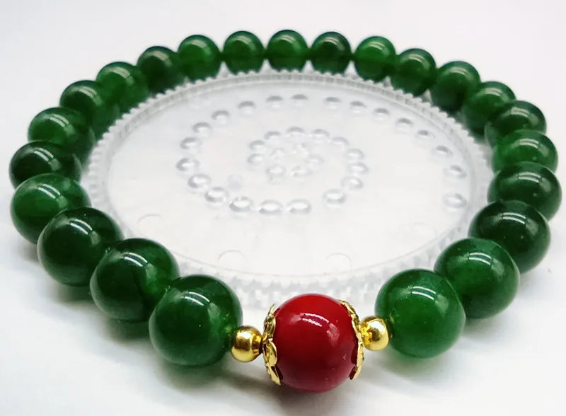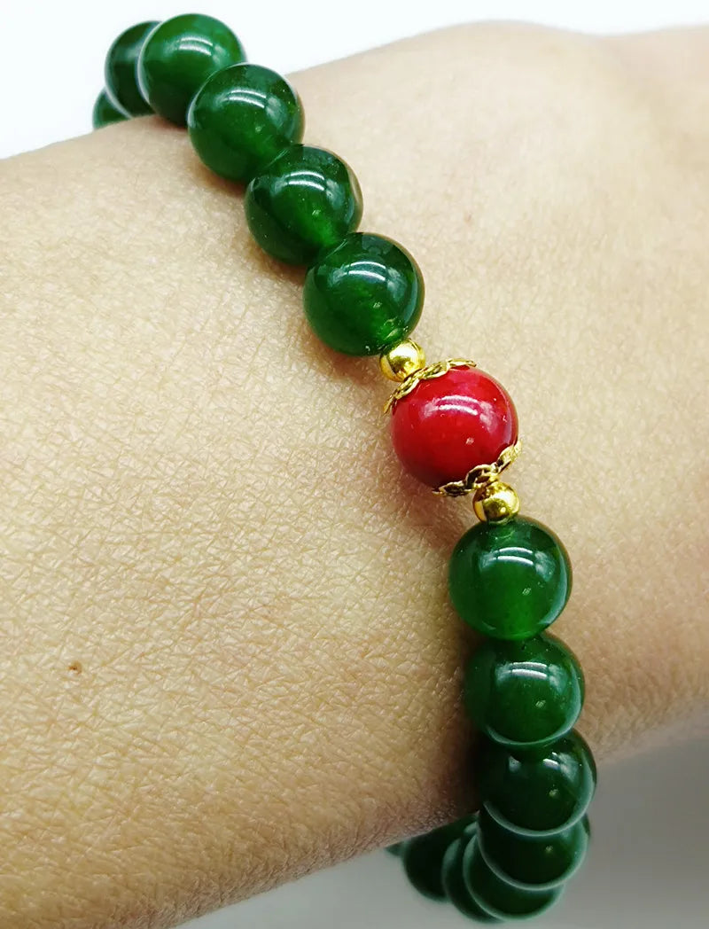Elegant 8mm emerald and red coral bead bracelet with elastic band. High-quality women's jewelry for a touch of sophistication.