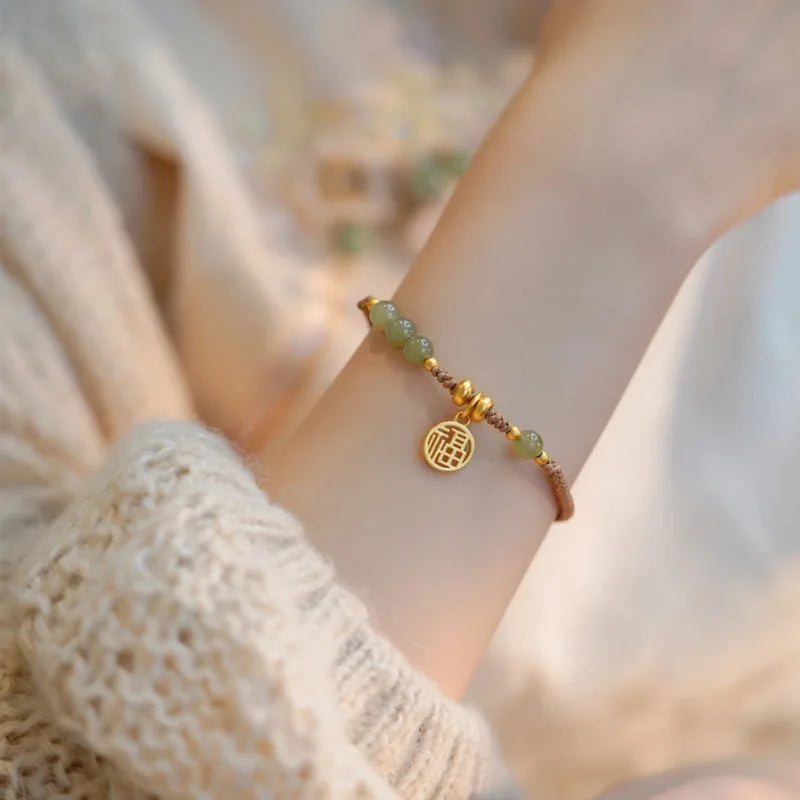 Elegant Hetian Jade round bead bracelet with Chinese character lucky charm. Handwoven adjustable braided design, perfect for women and girls. Fine jewelry accessory that brings good luck and fortune.