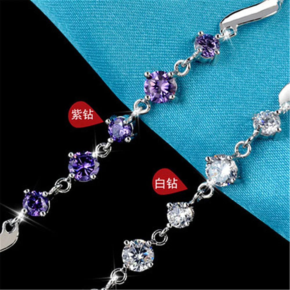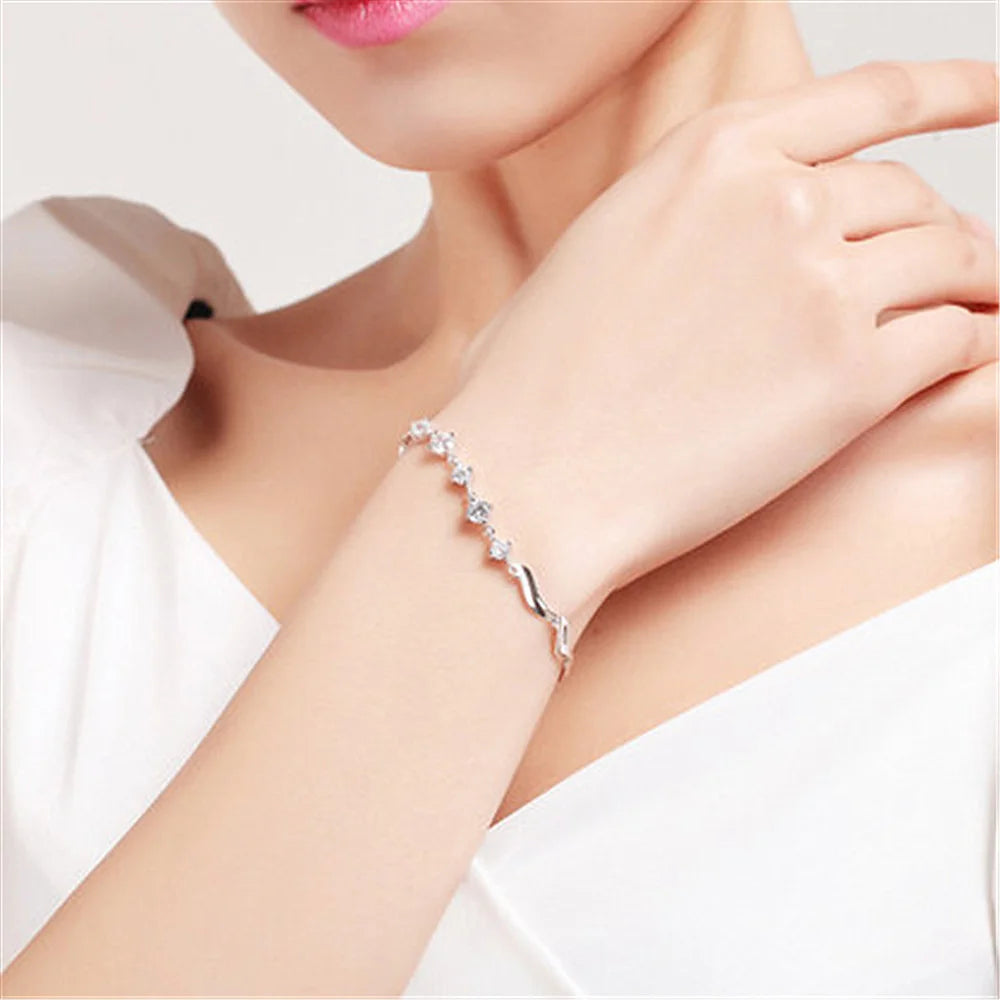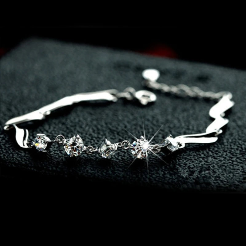 Elegant and sparkling bracelet featuring moissanite diamond charms in platinum plating on sterling silver. This bracelet makes a perfect promise gift for women and girls.