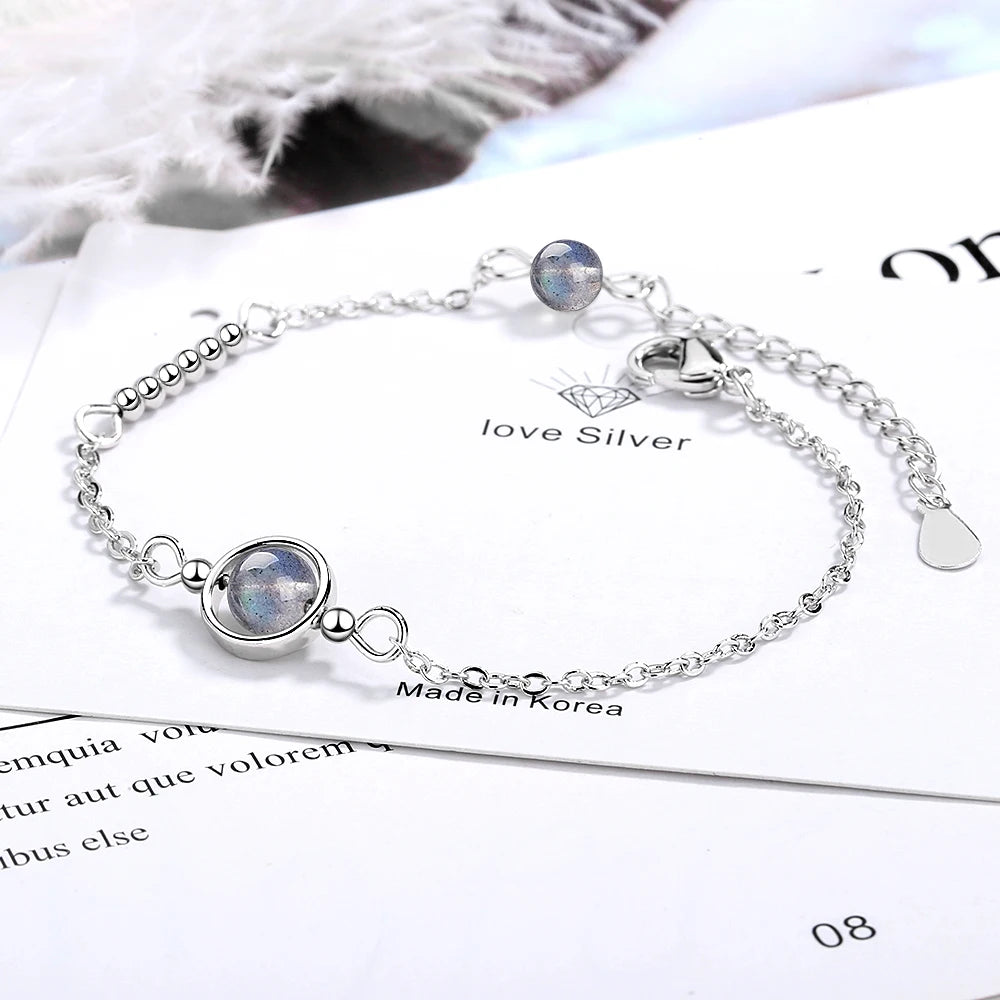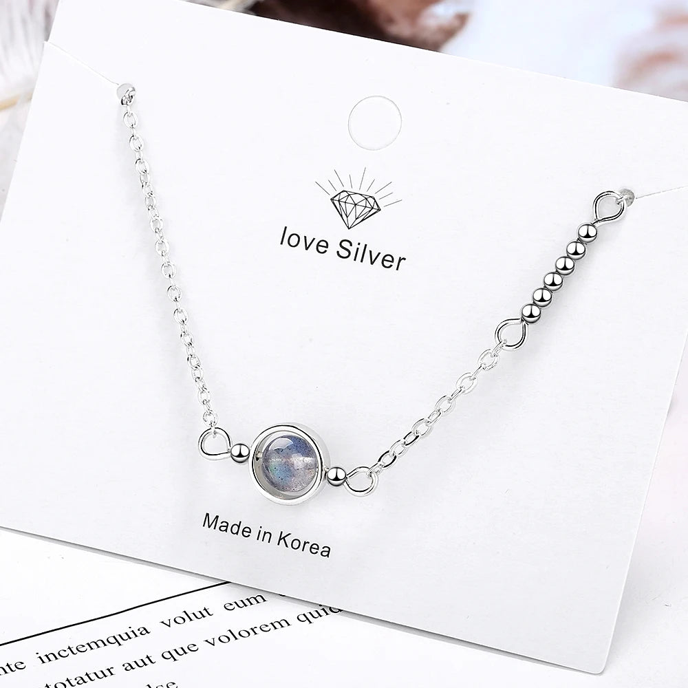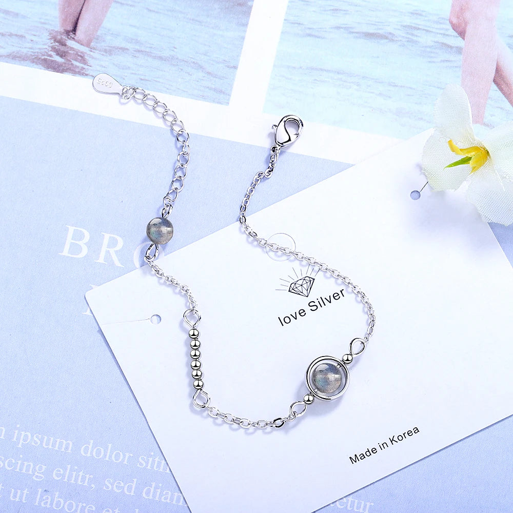 This stunning moonstone bracelet features a circle charm with natural crystal and 925 sterling silver beads. A personalized accessory that shines with elegance and style.