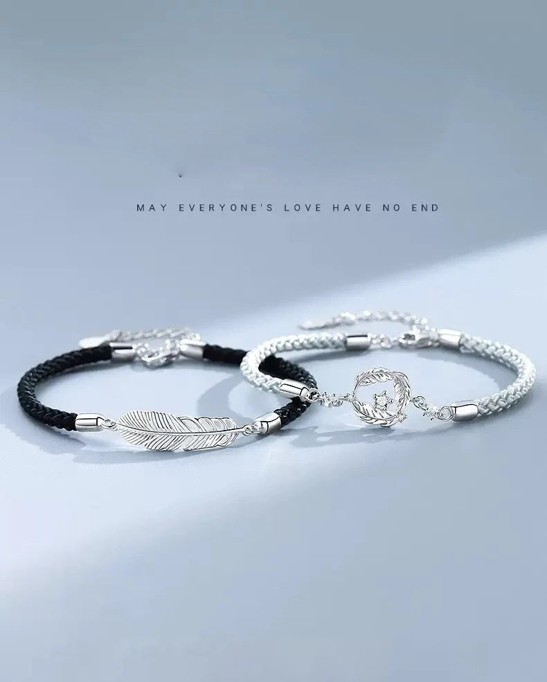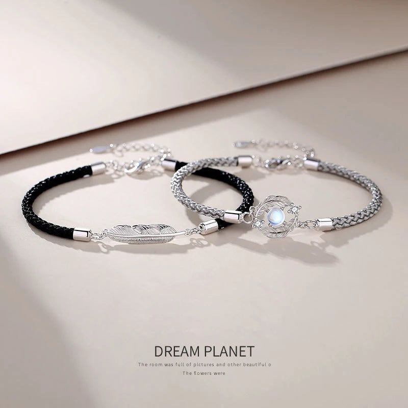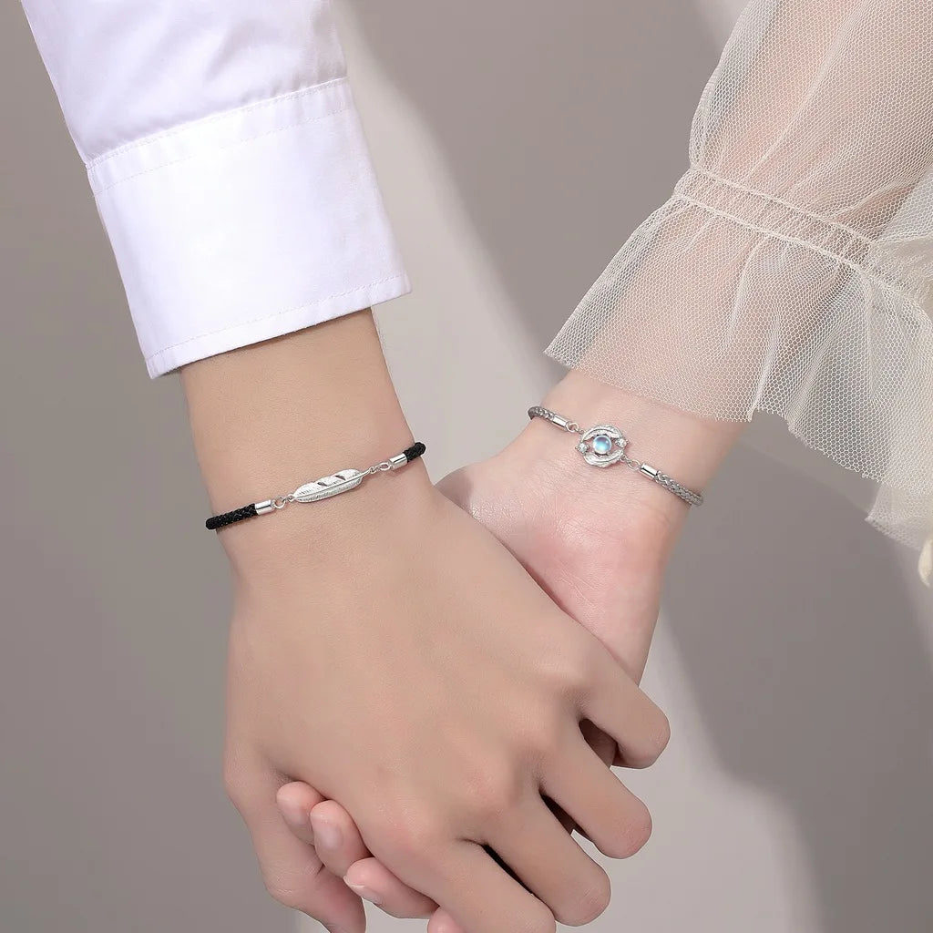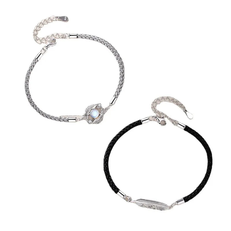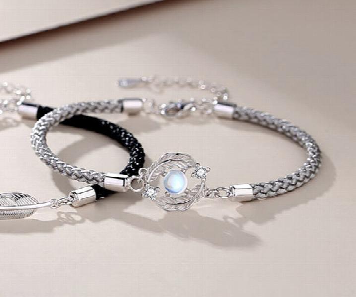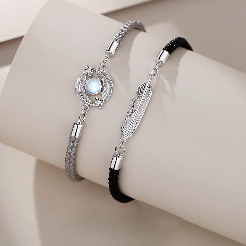 This set of bracelets features silver moonstone light feather pendants, symbolizing long distance love. Perfect for couples separated by miles with a deep connection.