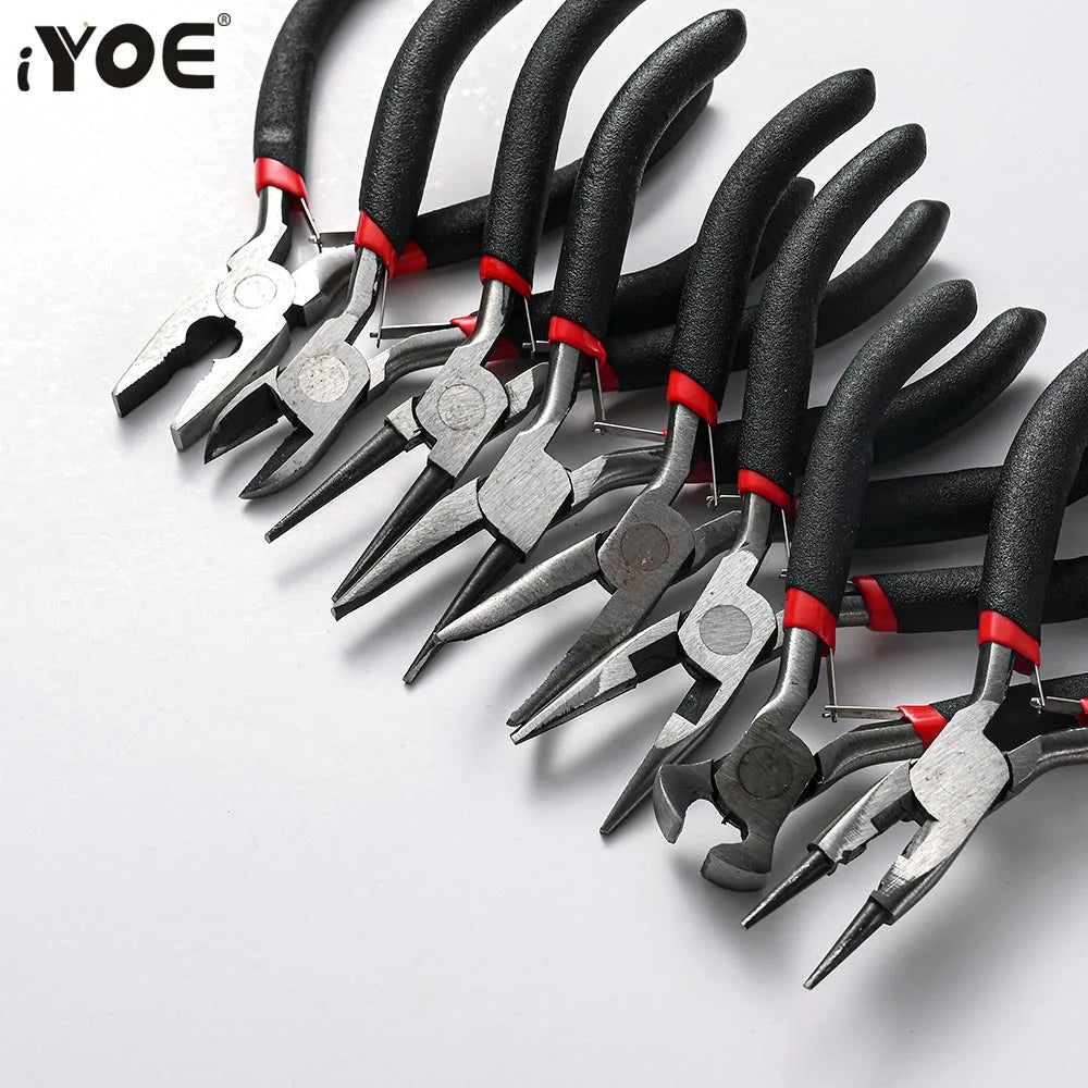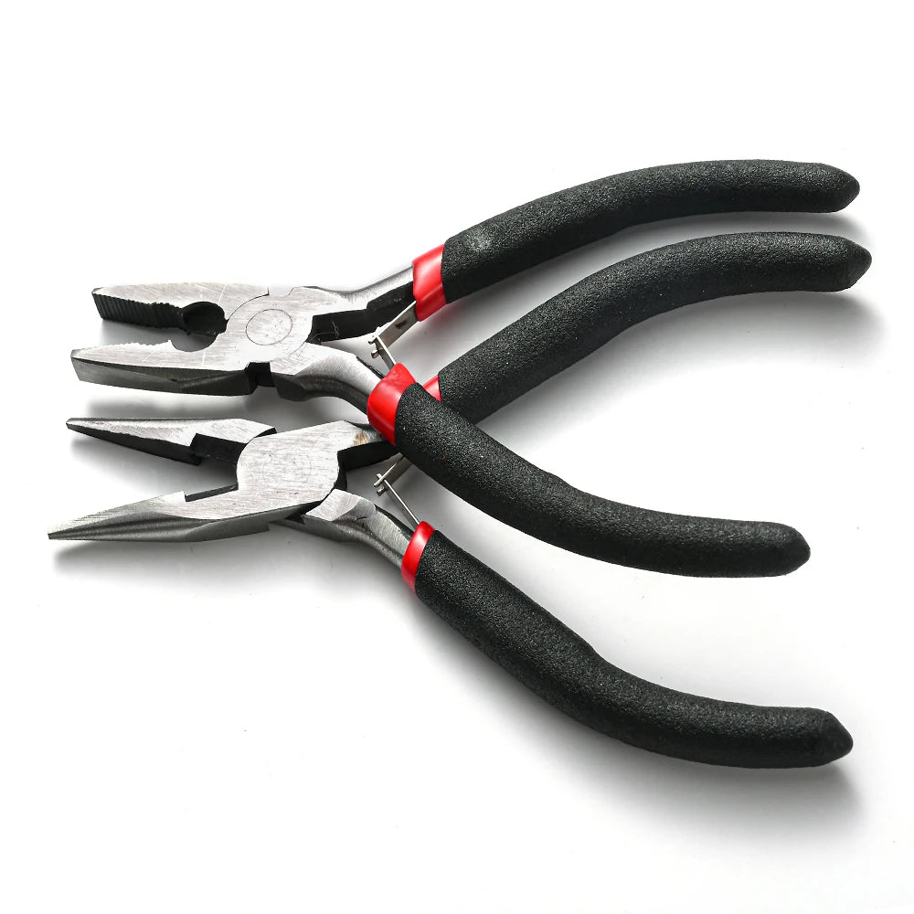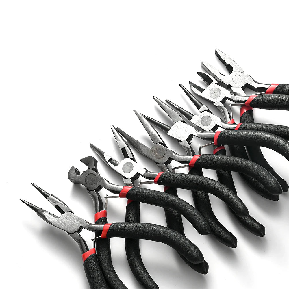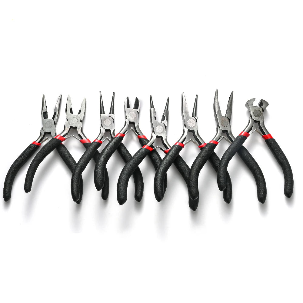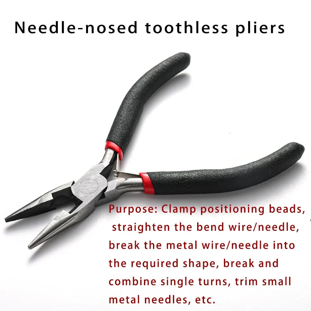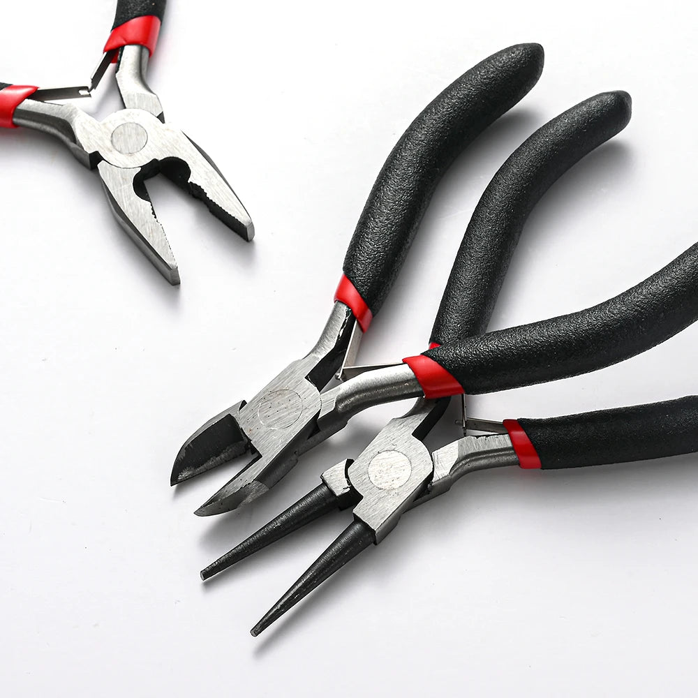 This versatile tool set includes wire cutter, bent nose, and needle nose pliers for jewelry making. The round head and pointed nose design provide precision handling.
