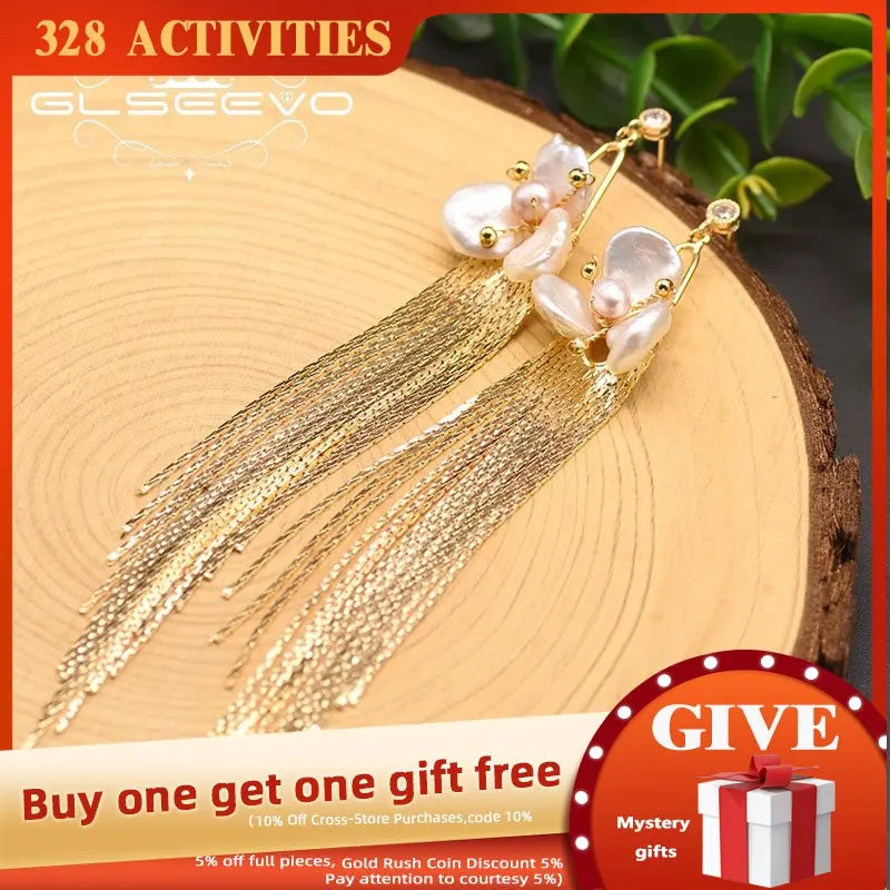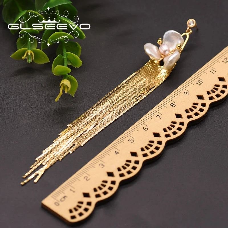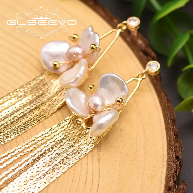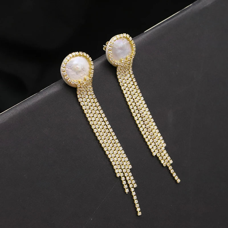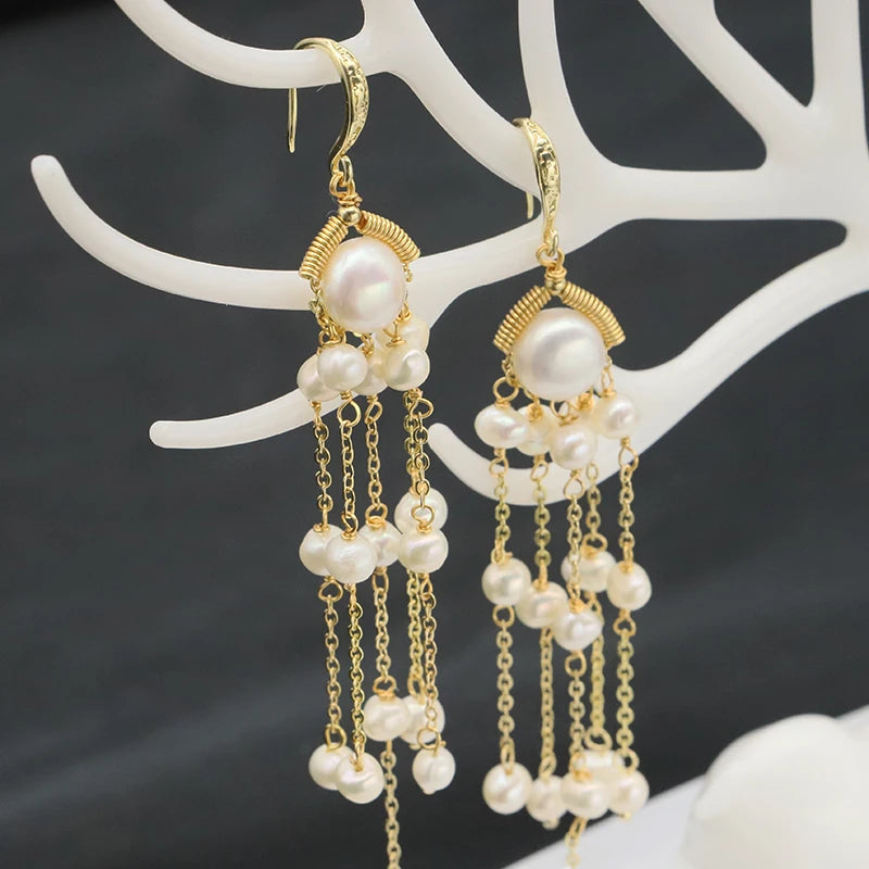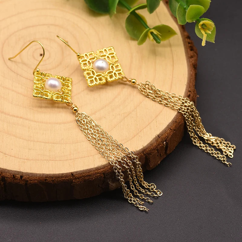 Elegant and charming drop earrings featuring natural fresh water flower design with long tassel charm. Perfect for engagement or fine jewellery occasions.