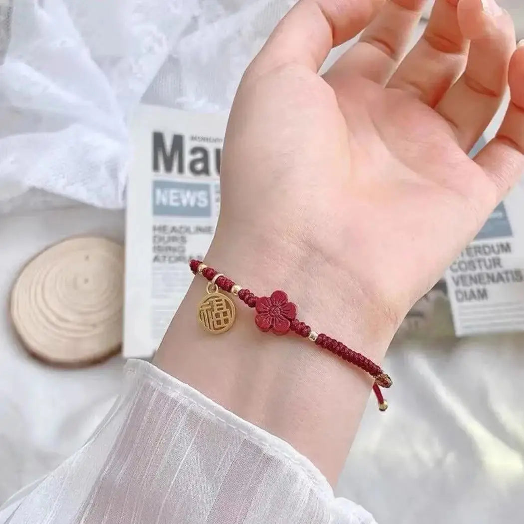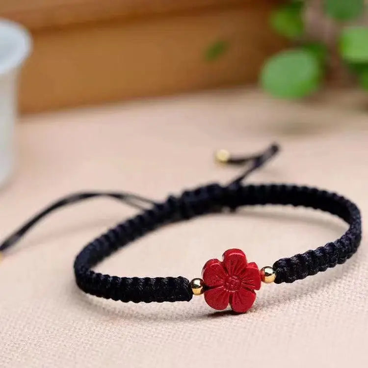 This natural cinnabar bracelet features a small red flower design. Hand-woven with purple sand red hand rope, this bracelet is a symbol of peace and makes a great gift for females.