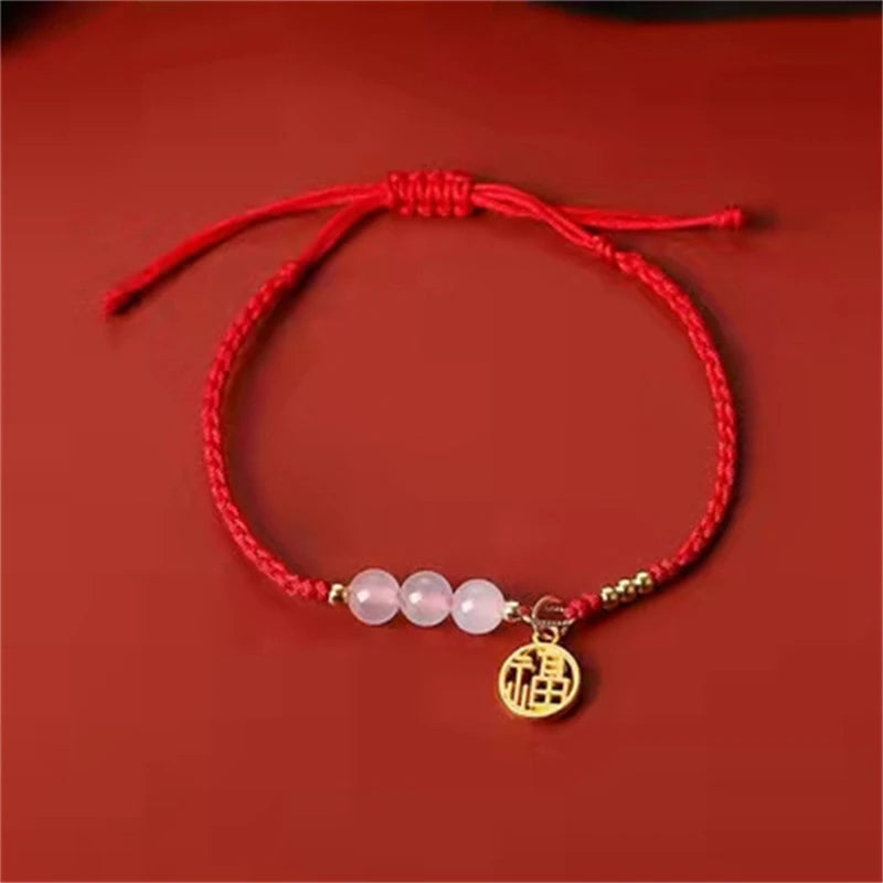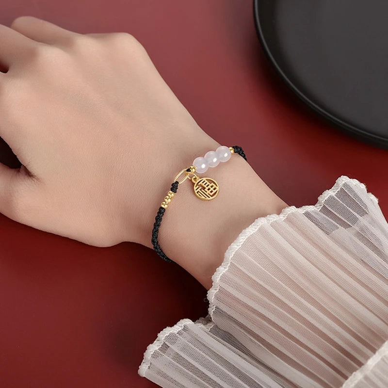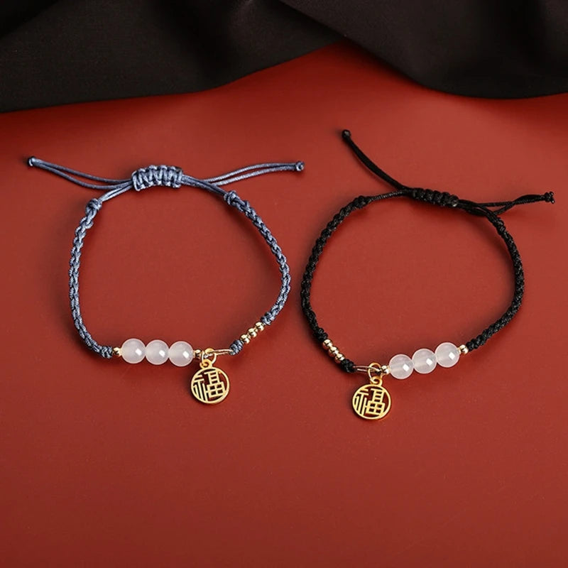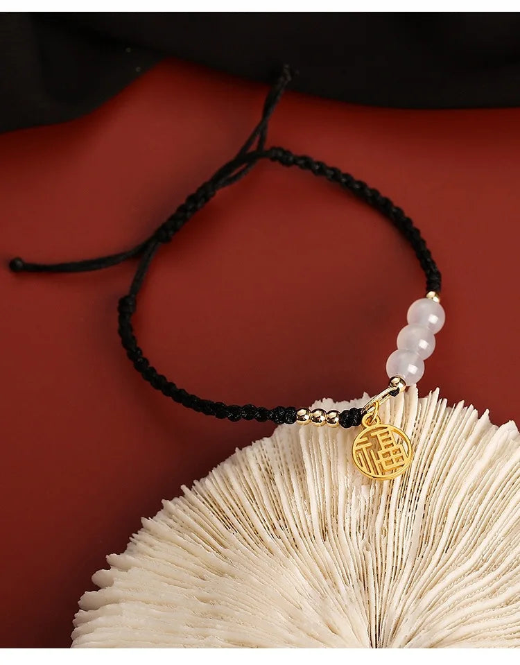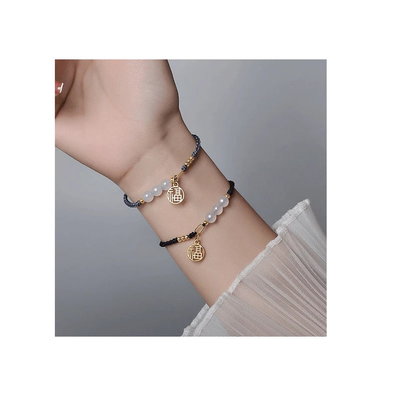 This bracelet features round natural chalcedony beads with a Chinese character blessing charm, perfect for both women and men.