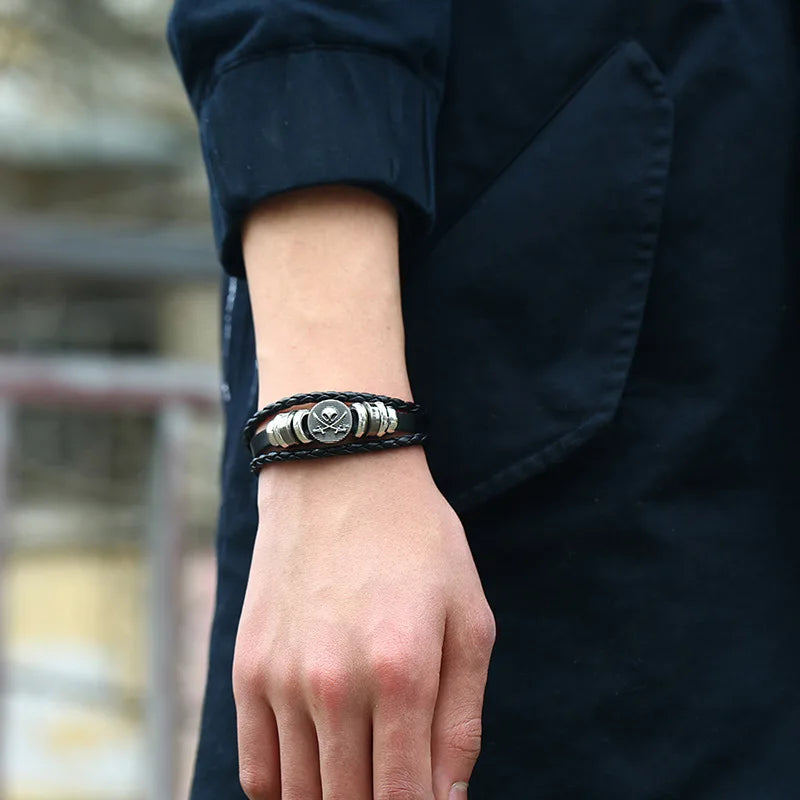 Add a touch of vintage style with this versatile leather bracelet featuring beaded skull design. Perfect for both men and women.