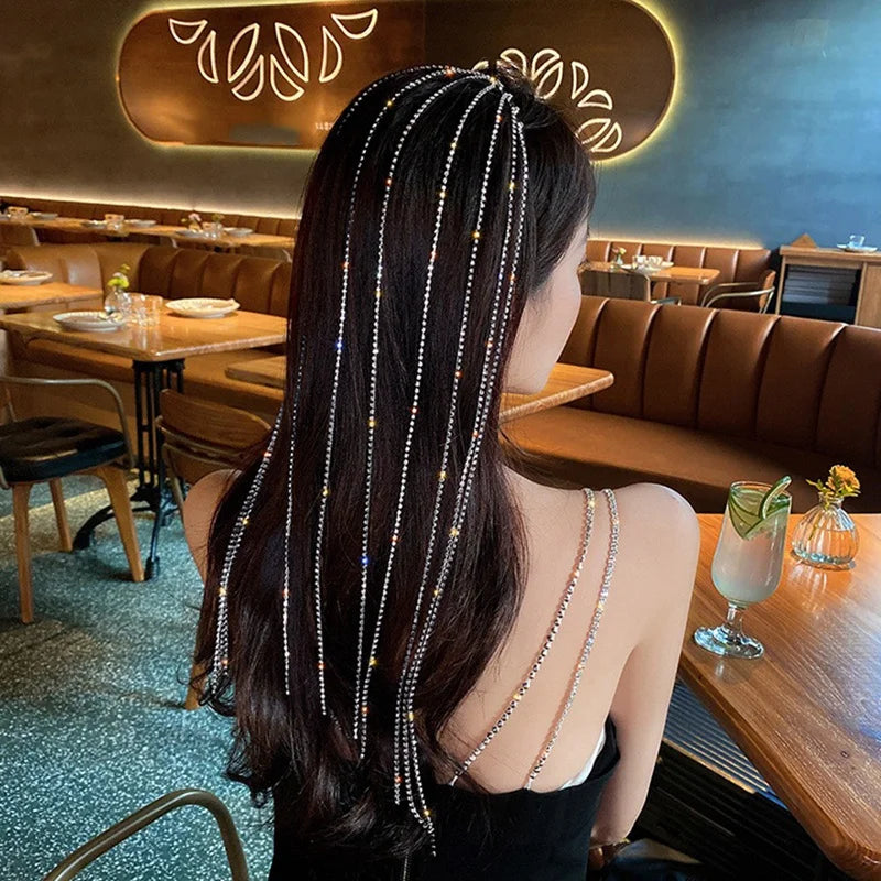 Elegant headband with long tassel crystal hair clip, perfect for weddings and parties.