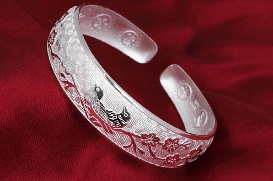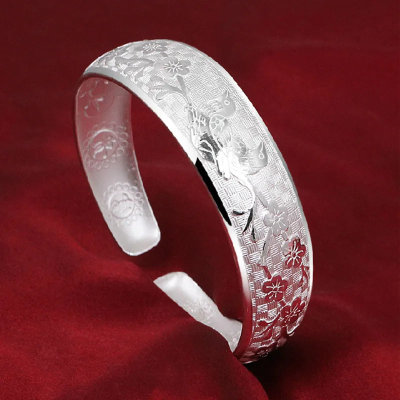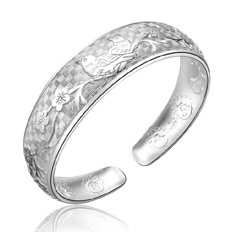 S925 Silver Bird Flower Twig Bracelet Bangle for Women Girl Lady