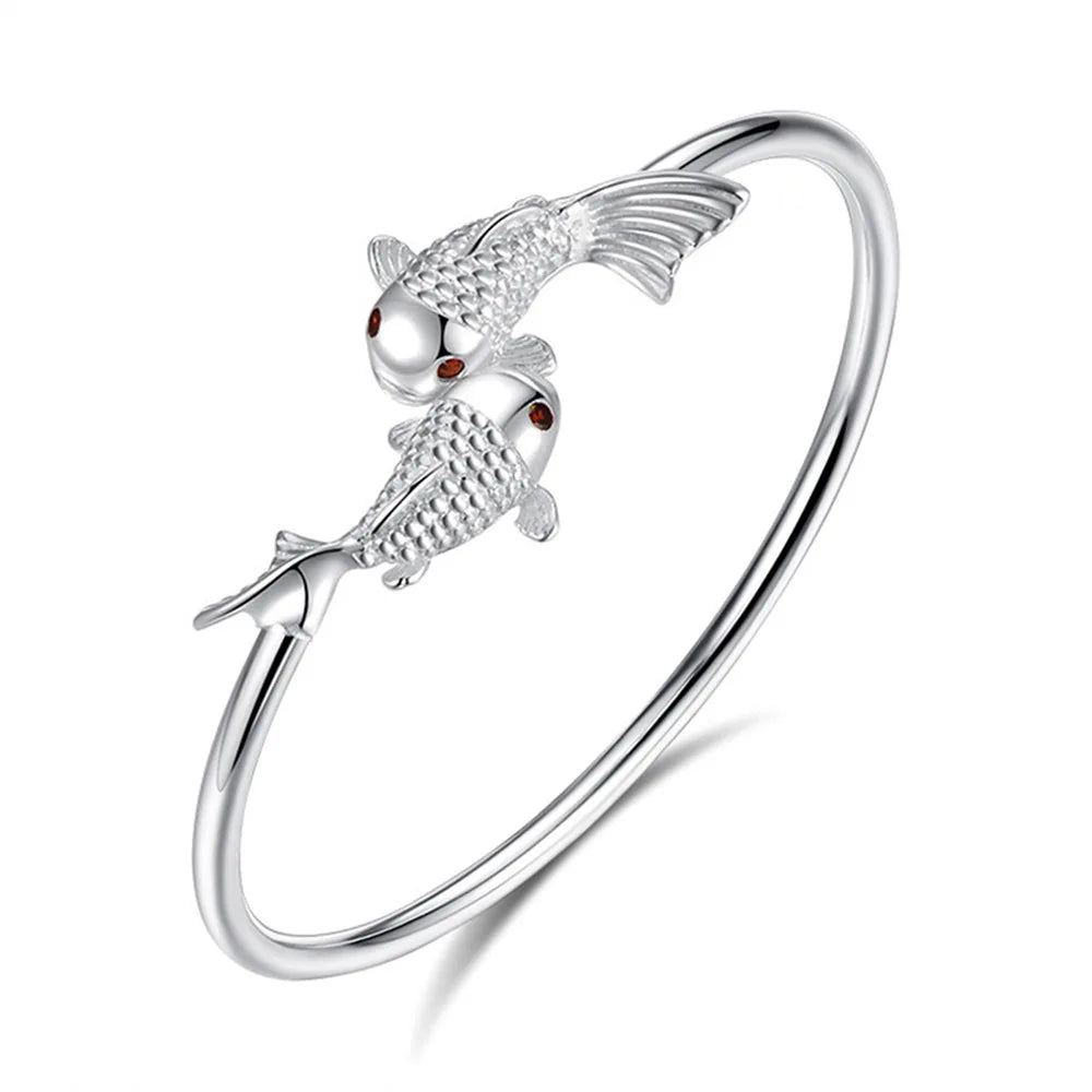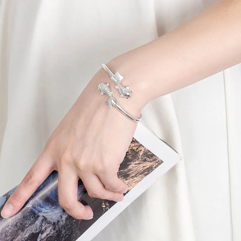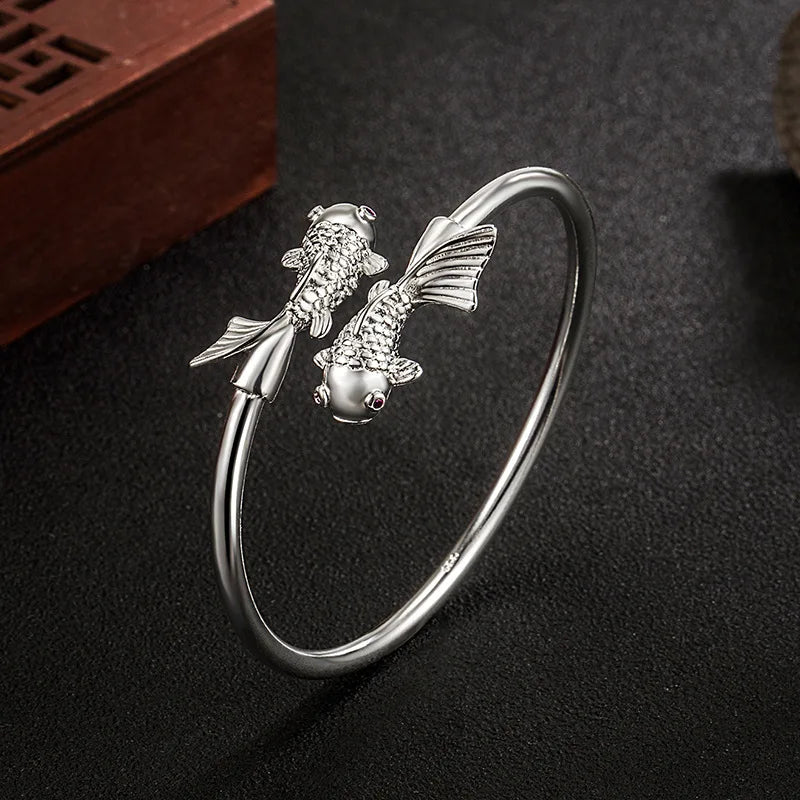 This beautiful S925 silver bracelet features a lucky fish design. It is a resizable bangle that makes a perfect gift for weddings, birthdays, or any special occasion.