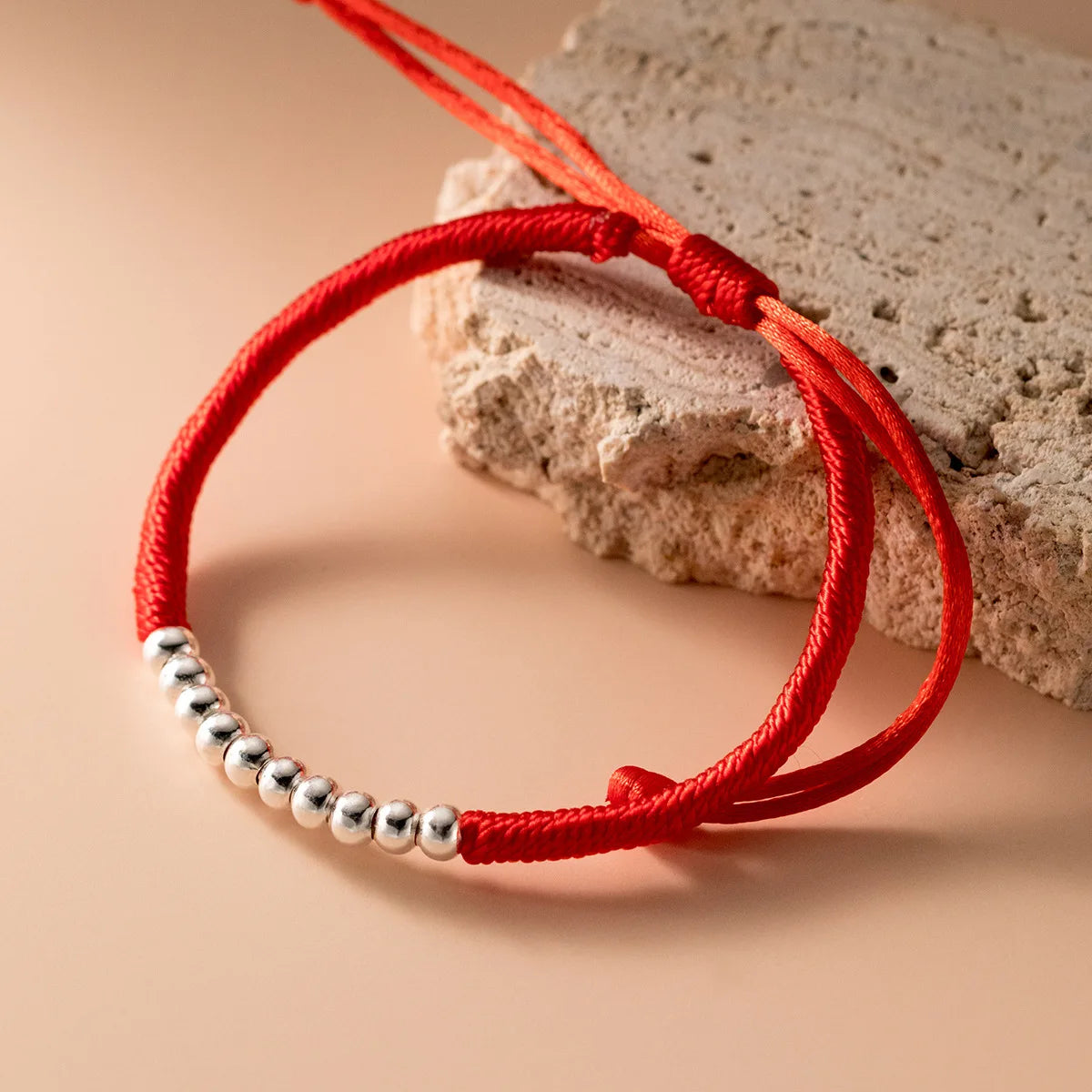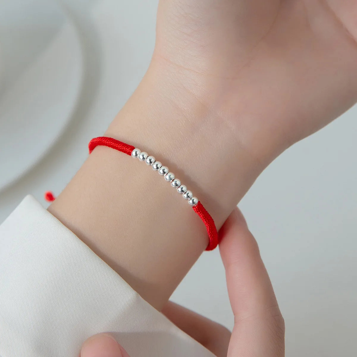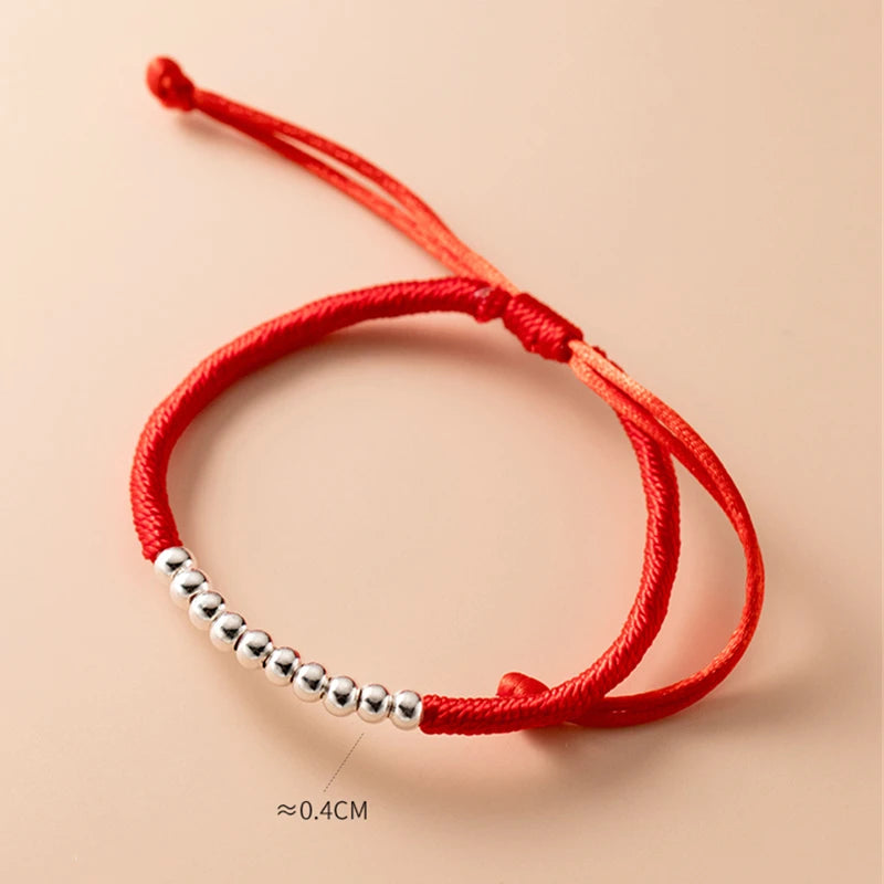 This beautiful bracelet is crafted from sterling silver with 10 balls on red ropes. It is adjustable and perfect as a hand-woven accessory for women.