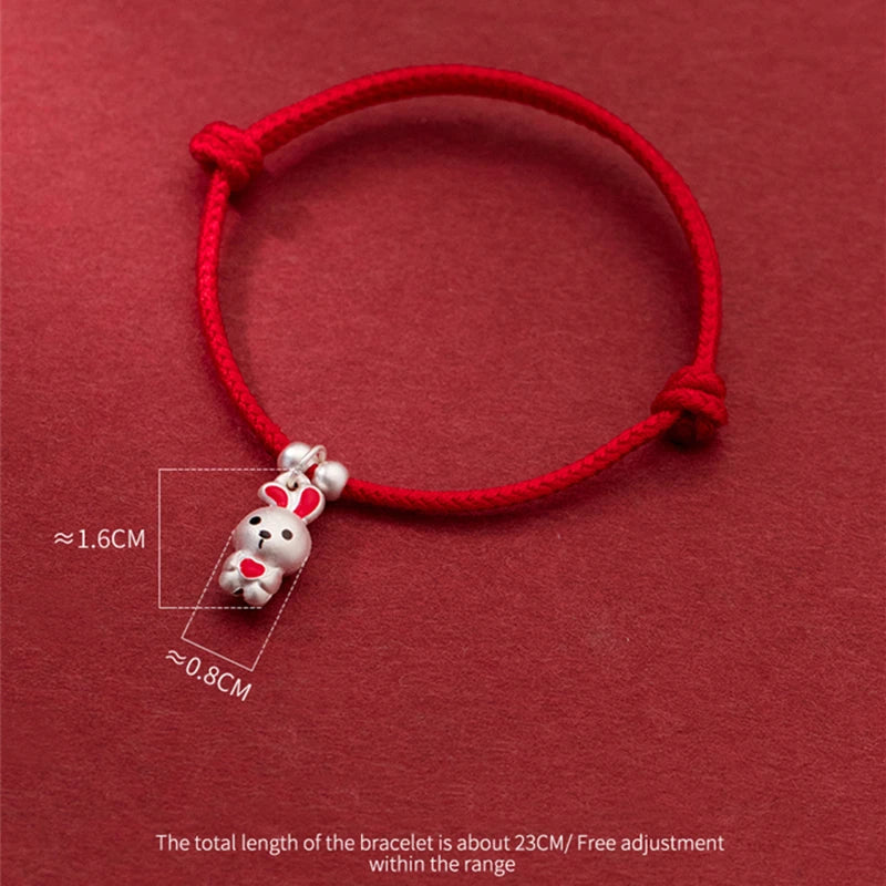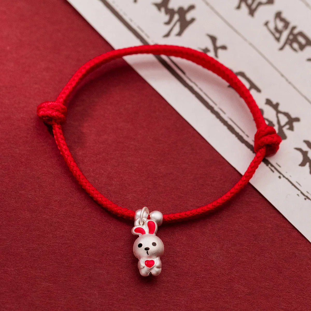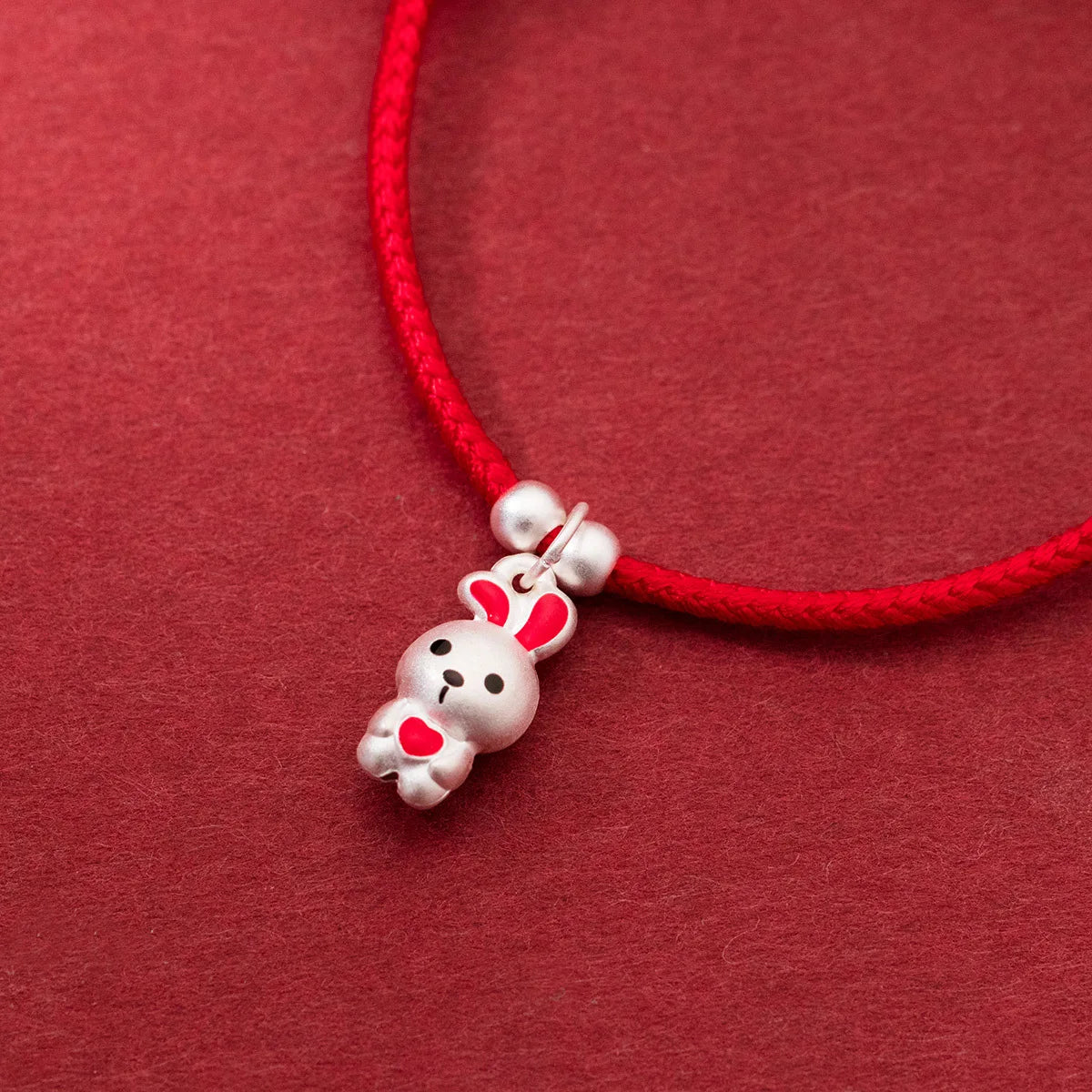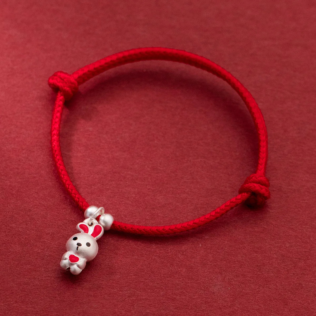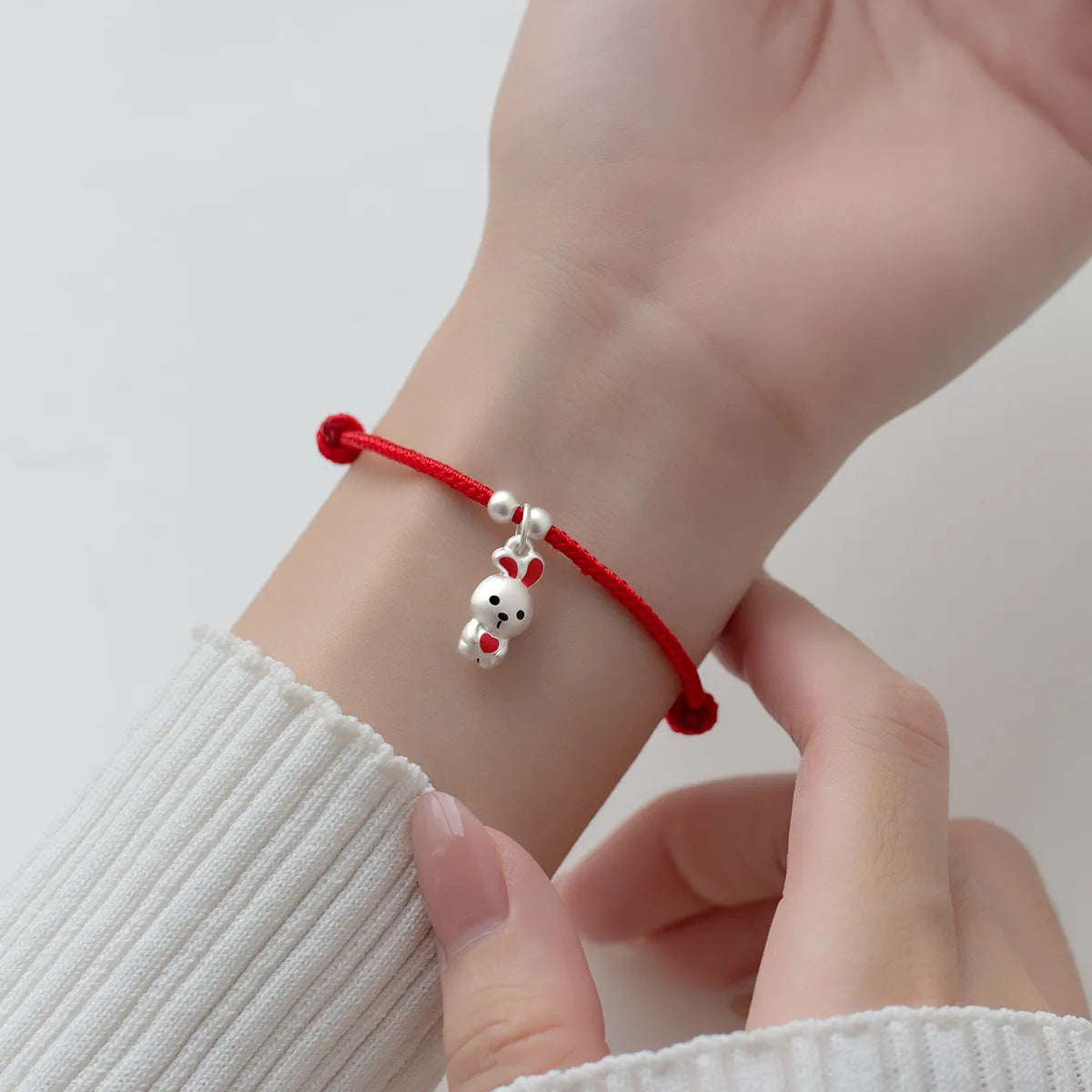 Adorable sterling silver frosted rabbit charm on a red adjustable rope bracelet perfect for daughters or young girls.