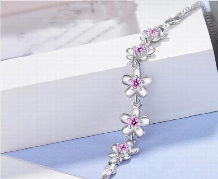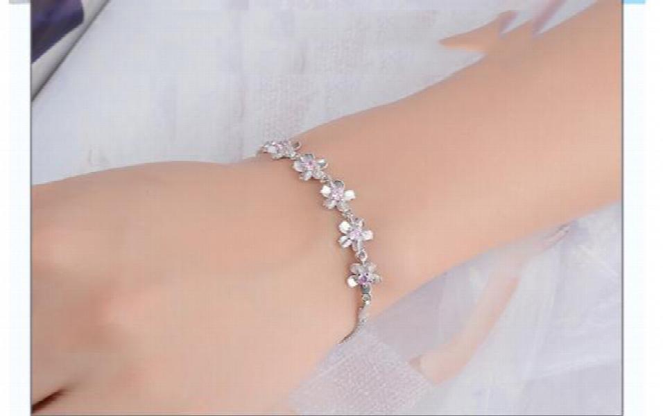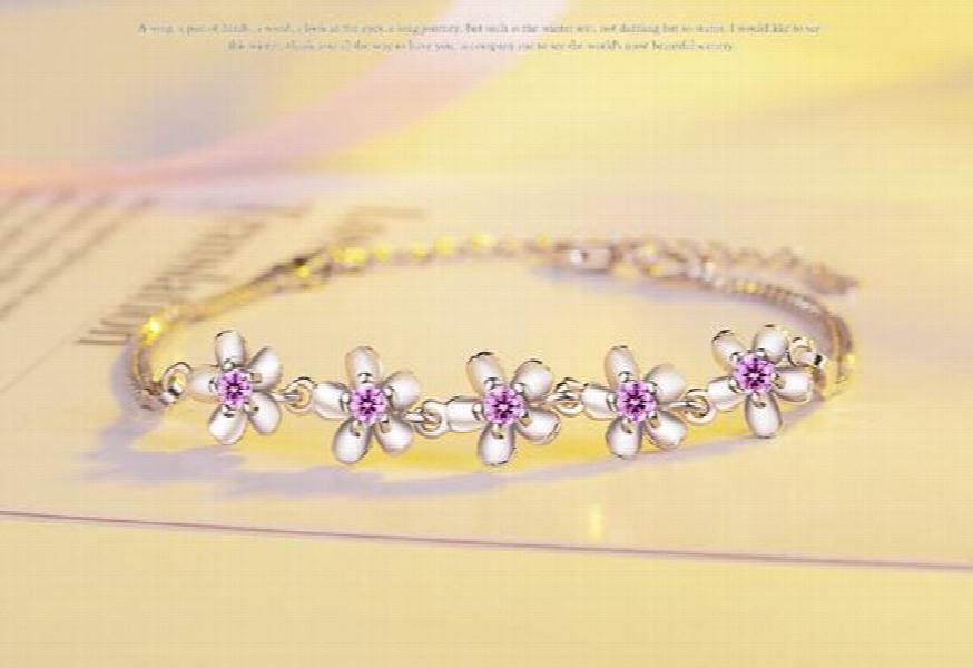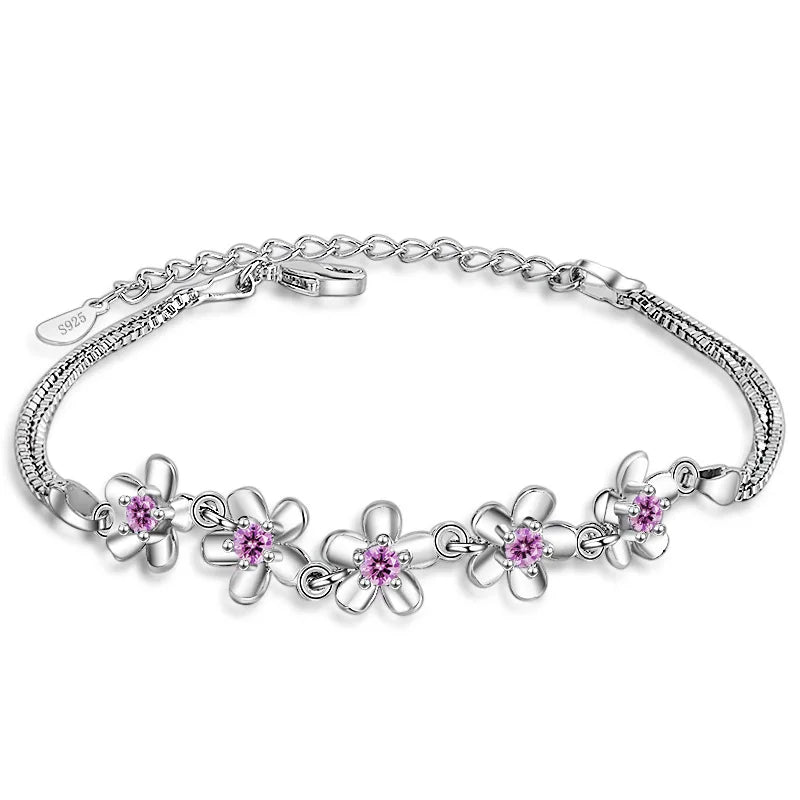 Elegant and stunning, this silver chain bracelet features a beautiful flower charm adorned with purple crystals. Perfect for brides or weddings.