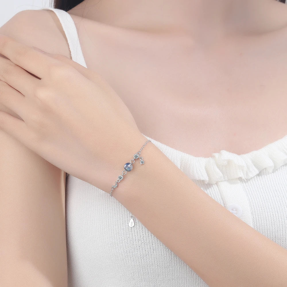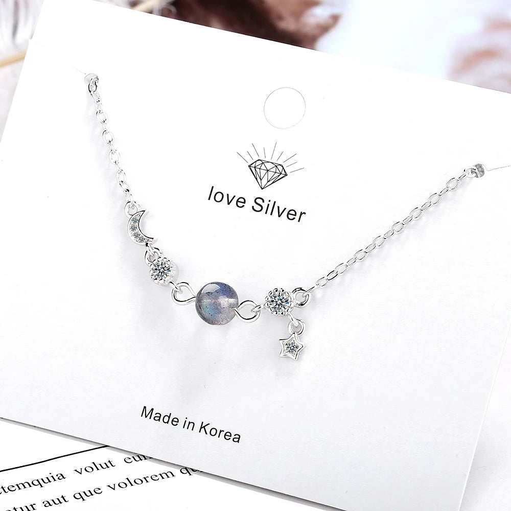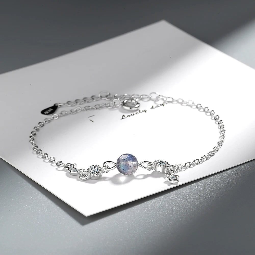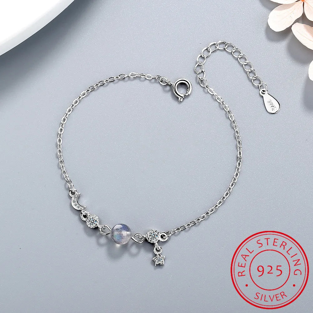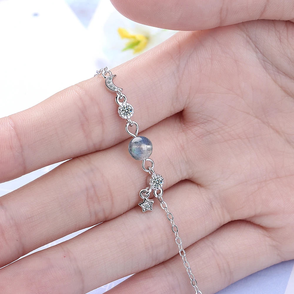 Elevate your summer style with this stunning 925 sterling silver moonstone bracelet. The delicate design features a moon and star charm with a tassel detail, perfect for women and girls.