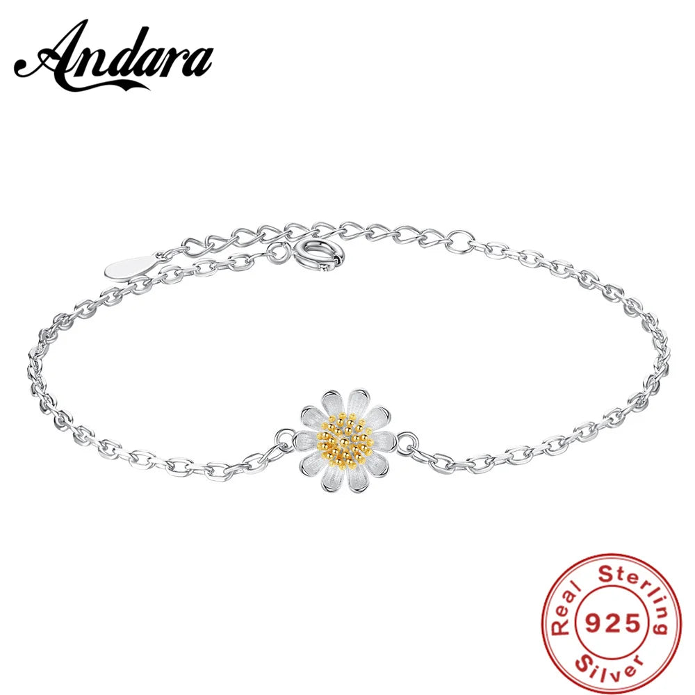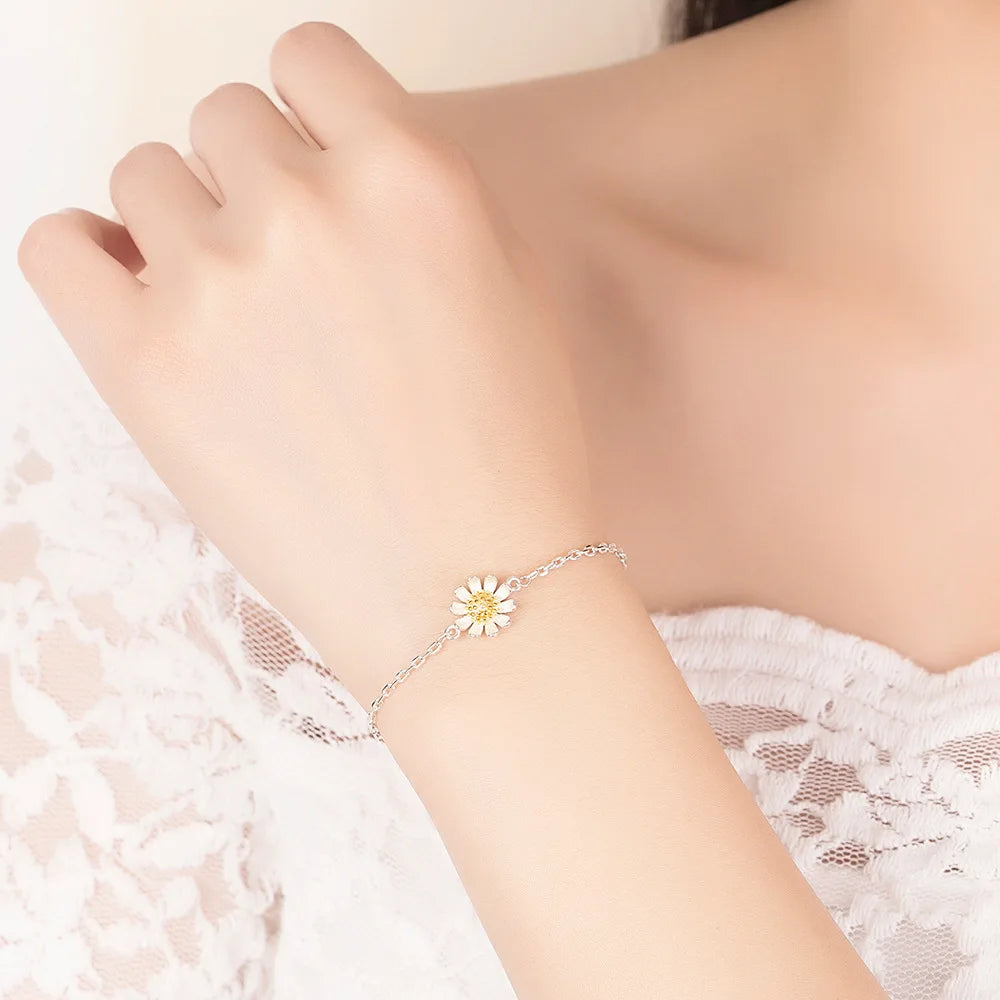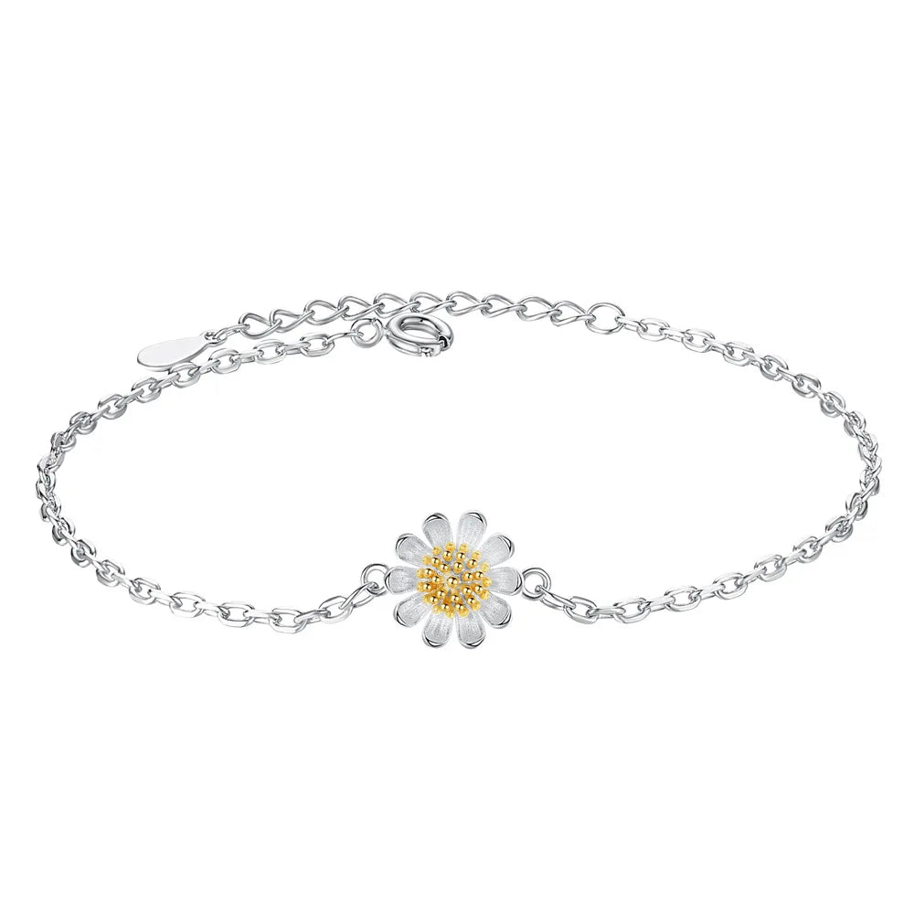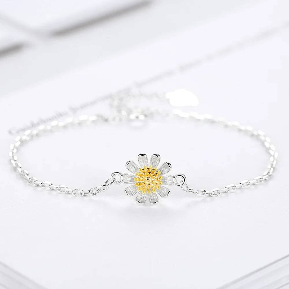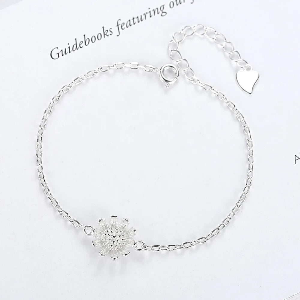 Beautiful S925 sterling silver bracelet featuring a sunflower design with small daisies and chrysanthemum accents. A perfect gift for women who love nature-inspired jewelry.