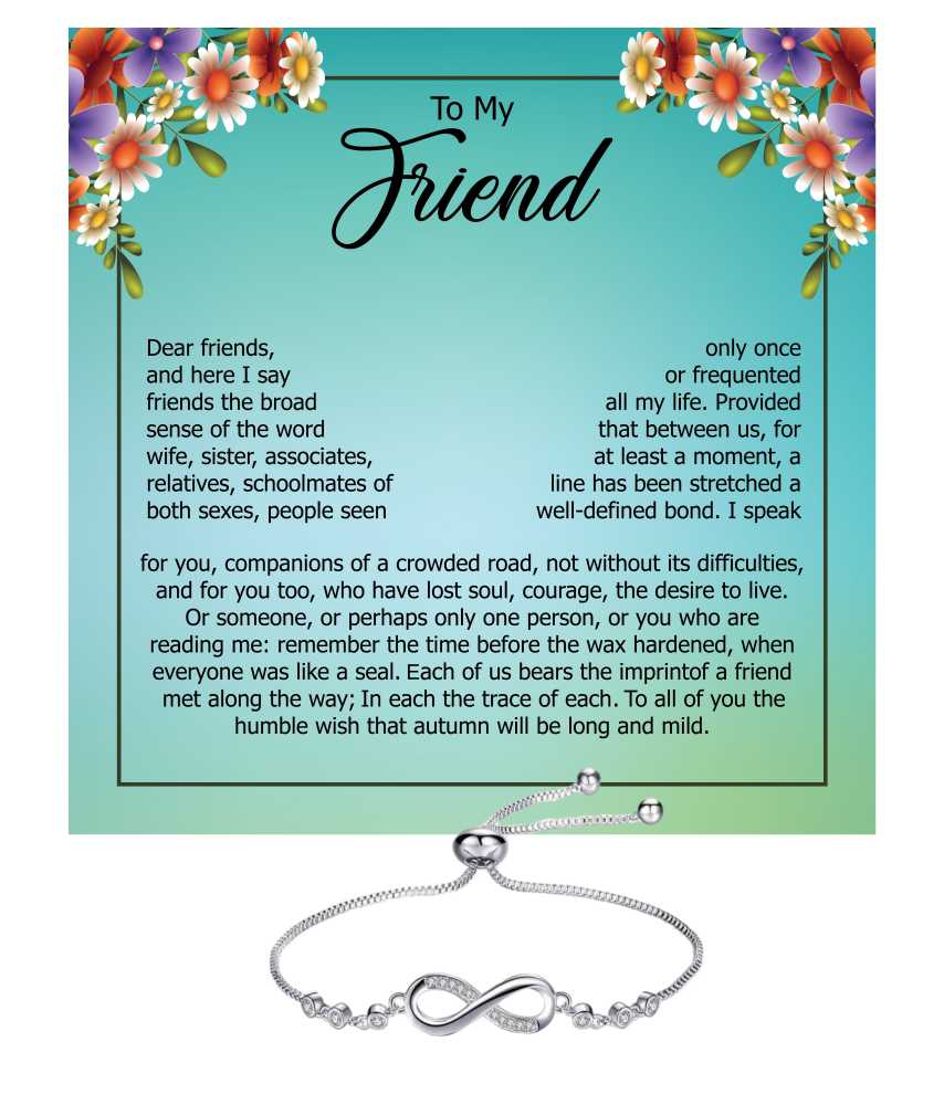 Bling Queen is an affordable fashion jewellery brand with various product types like bracelets, necklaces, earrings, rings, etc. suitable for women, men and kids. The silver zirconia infinity bracelet is a beautifully crafted piece, perfect for celebrating your friendship. This elegant bracelet features an infinity symbol, adorned with sparkling zirconia stones that shimmer with every movement, representing the limitless bond you share. Accompanying the bracelet is a charming message card adorned with a lovely floral design. The vibrant flowers symbolize friendship, growth, and the beauty of your connection. This enchanting backdrop enhances your heartfelt message, allowing you to express your appreciation and love for her in a meaningful way. Together, the bracelet and message card create a perfect gift that combines elegance with emotional significance.