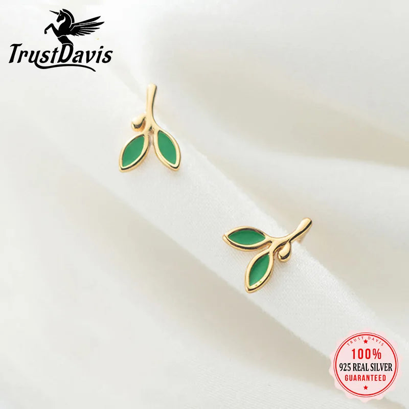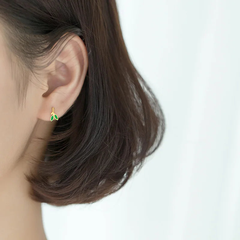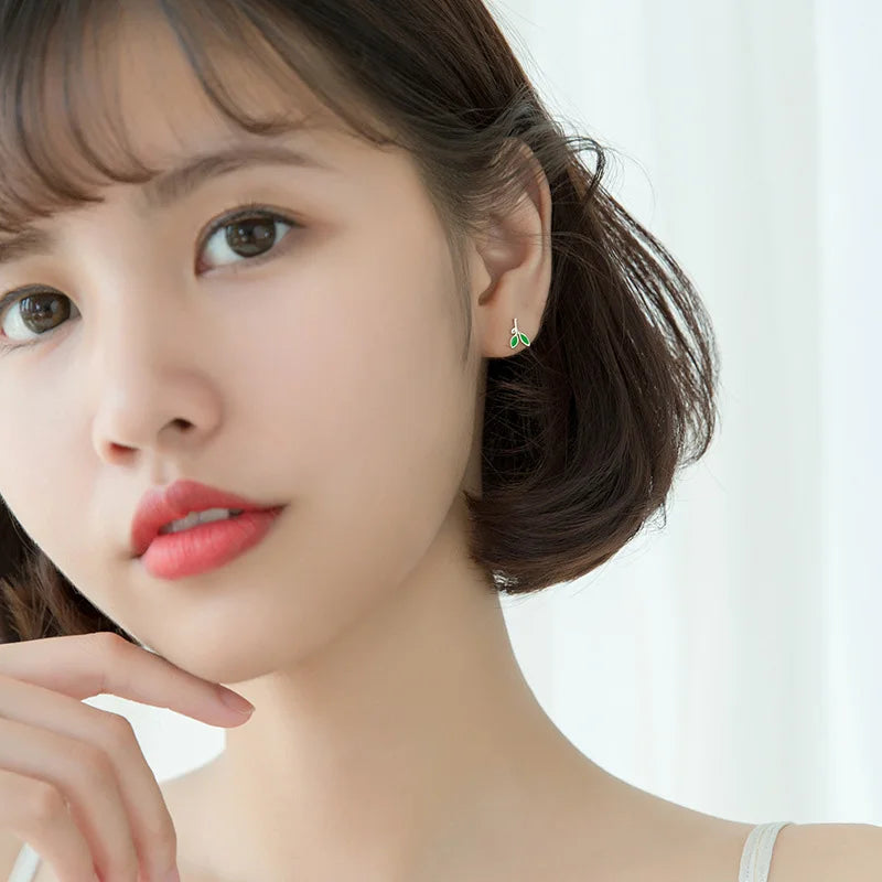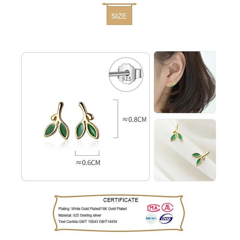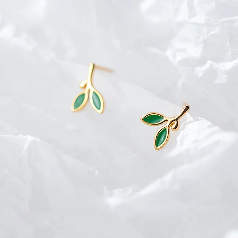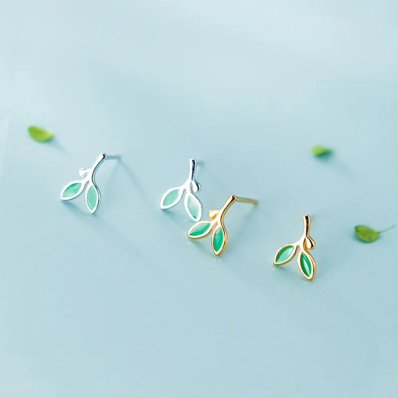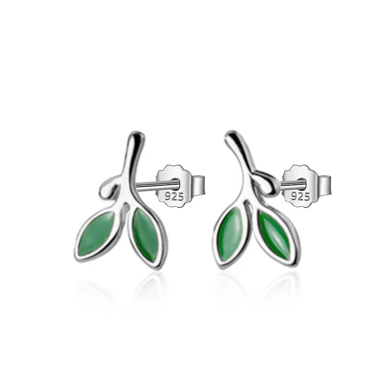 Elegant sterling silver stud earrings featuring sweet green leaves design. Perfect for weddings and special occasions.