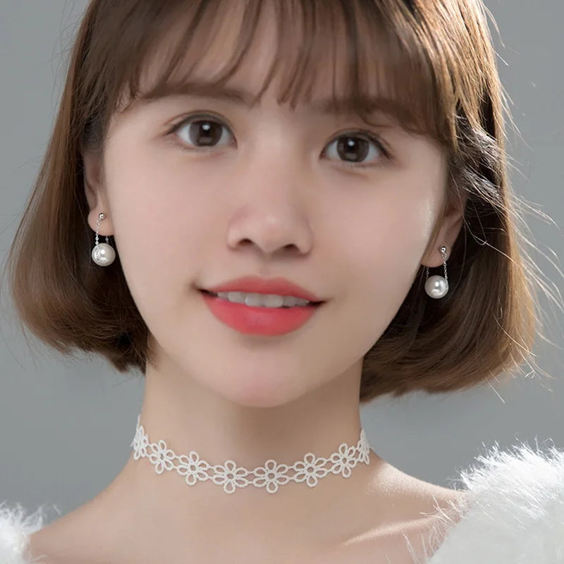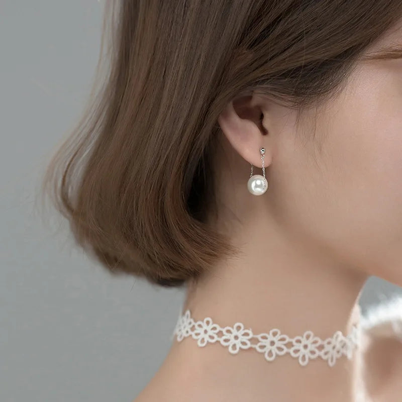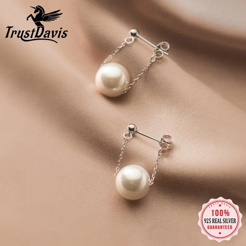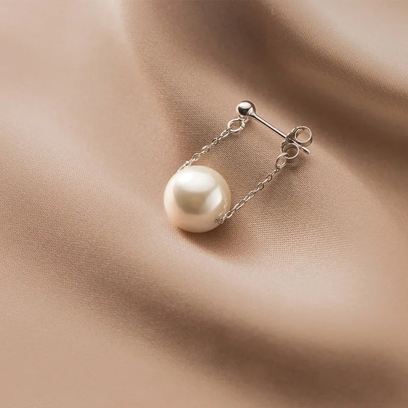 Elegant and stylish sterling silver stud earrings with synthetic pearl chain design, perfect for weddings.
