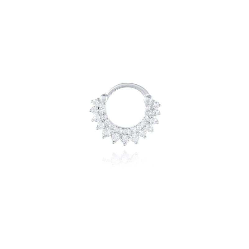 This hoop earring comes with an intricate design and a jazzy finish with cubic zirconia stones. This piece can be worn as a tragus, daith, cartilage, helix, septum, and even as a nose ring. This beautifully unique hoop earring is perfect for everyday wear.