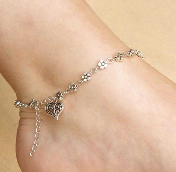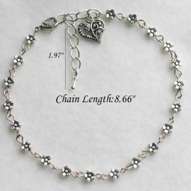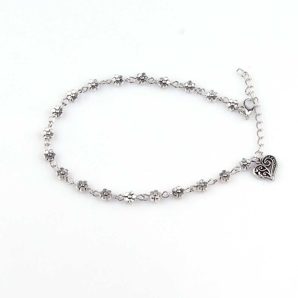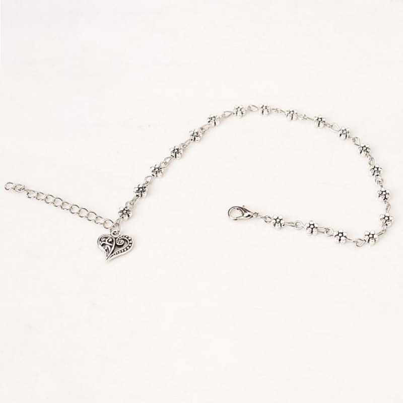 Women's Floral Oxidised Heart Shaped Single Anklet With Heart Charm