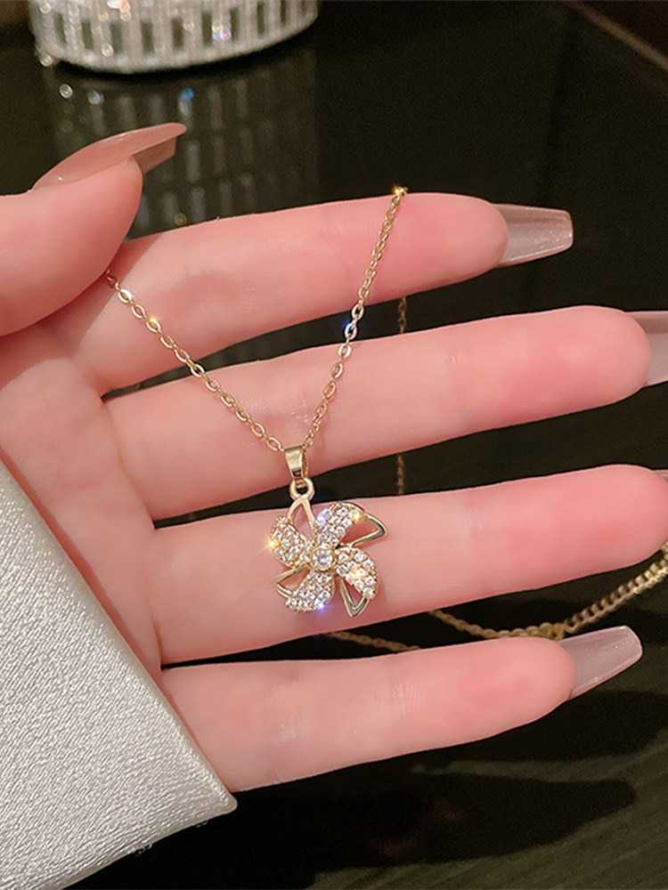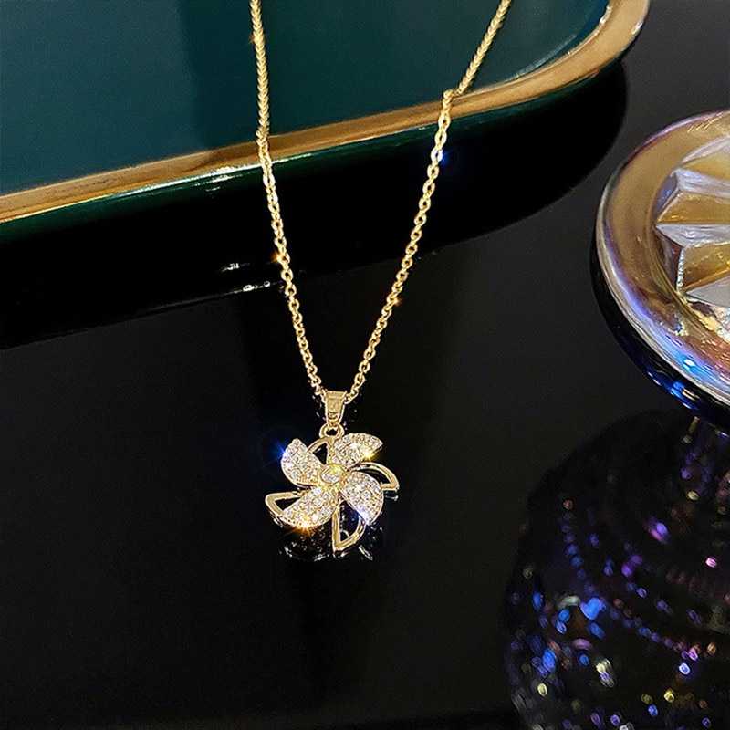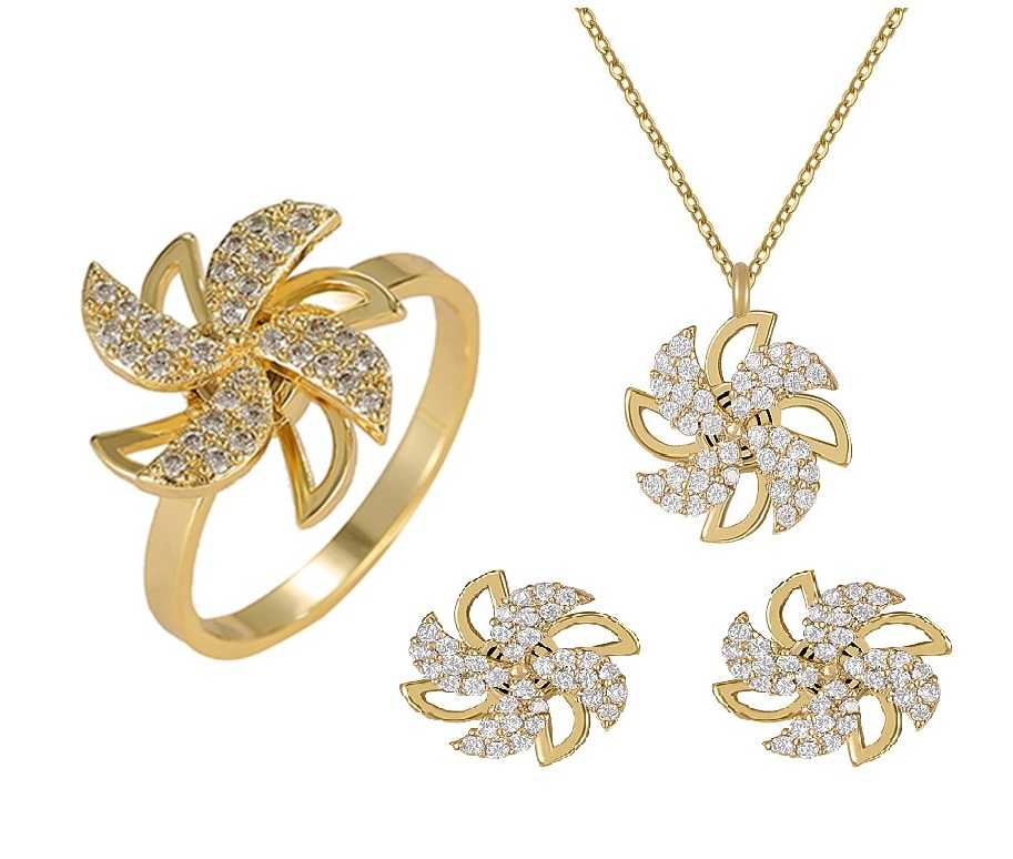 A harmonious blend of elegance and innovation that transcends traditional design boundaries. This enchanting set includes a pendant, ring, earrings, and a matching chain, each meticulously crafted to elevate your style to new heights. The centerpiece of this collection is the captivating rotating windmill pendant. Skill fully plated in lustrous gold, it exudes opulence and sophistication. The intricate detailing of the rotating windmill adds a touch of whimsy and dynamism to the design, making it a truly unique and eye catching statement piece. Complementing the pendant, the ring and earrings feature a harmonious blend of curves and angles, echoing the graceful movement of the windmill. The gold plating enhances the luxurious appeal, ensuring that each piece in the set exudes a radiant glow. To complete the ensemble, the set includes a delicate chain crafted with precision to showcase the pendant effortlessly. The chain's design is understated yet complements the overall aesthetic, allowing the pendant to take center stage. This jewelry set is not just an accessory it is a conversation starter, a work of art that reflects your refined taste and appreciation for craftsmanship. Whether worn as a complete set or as individual pieces, it is a symbol of style, sophistication, and a celebration of timeless beauty. Elevate your wardrobe with this stunning collection and make a statement that transcends trends.