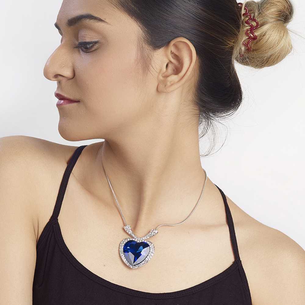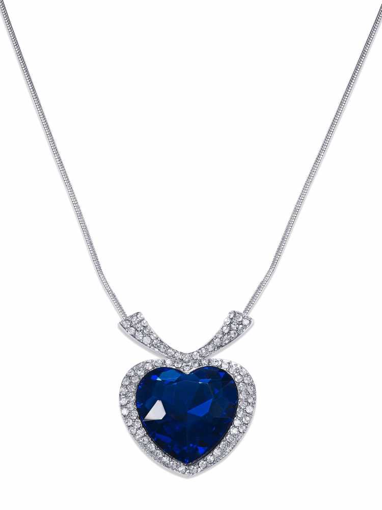 A masterpiece of jewelry that effortlessly merges elegance with contemporary style. This intricately designed accessory is a celebration of sophistication, featuring a captivating array of details that make it a standout piece in any collection. The centerpiece of this pendant is a heart shaped crystal zirconia that mesmerizes with its precision cut facets. This heart cut is not merely a shape it is a testament to craftsmanship, capturing and reflecting light in a dazzling display of brilliance. The choice of blue crystal zirconia elevates this pendant to new heights of refinement. The deep, lustrous blue hue adds an element of mystery and elegance, evoking the essence of a serene and starlit evening sky. The crystal zirconia is cradled in a meticulously designed setting, showcasing the artistry of the piece. The setting not only secures the gemstone but also enhances its beauty, creating a harmonious fusion of form and function. The pendant exhibits a spectrum of blue tones, from the profound and regal to the ethereal and dreamy. The play of colors within the crystal zirconia ensures that this accessory complements a range of styles and occasions. Striking the ideal balance between subtlety and statement, the pendant boasts dimensions that allow it to make a bold impact without overwhelming the wearer. It gracefully adorns the neckline, becoming a symbol of both confidence and grace. The pendant gracefully hangs from a sleek and contemporary snake chain, imparting a modern edge to the timeless design. The chain, smooth and fluid, adds an extra layer of sophistication to the overall aesthetic. The necklace is equipped with a secure clasp that not only ensures the piece stays in place but also serves as a tasteful accent. The ease of use adds a practical touch to the accessory. It is a symphony of artistry and sophistication. It transcends trends, embodying timeless beauty that captivates admirers and reflects the wearer's individuality and refined taste.