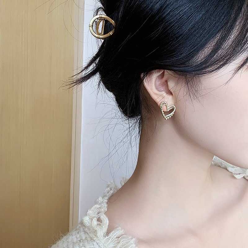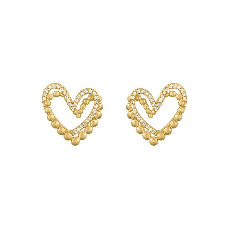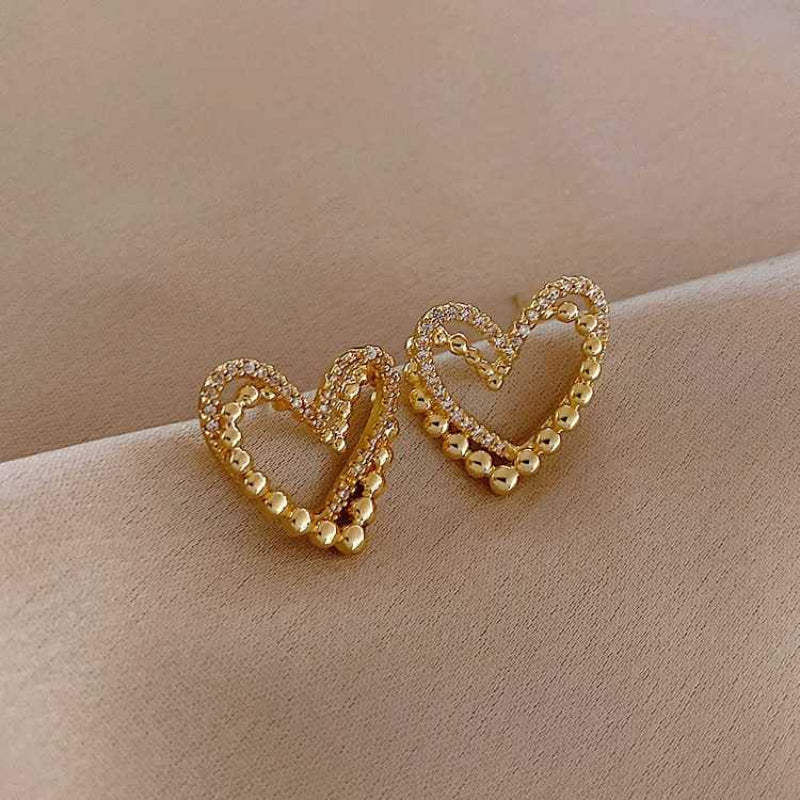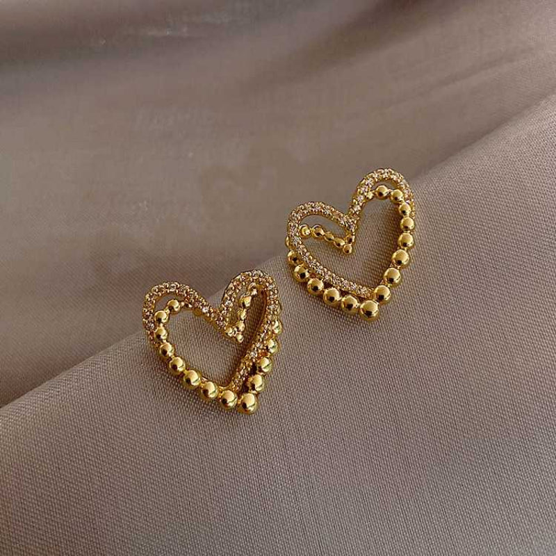 Classic modern interpretation, these stud earrings are made of copper alloy and studded with zircon stones. The heart shape earring is decorated with zircon stones. Two interconnected hearts highlight the jewelry and thus becomes unique eye-catchers. The heart earrings can be worn solo or combined with other jewelry collections of yours to create modern looks.