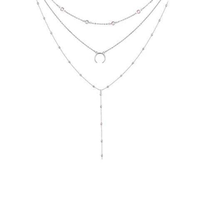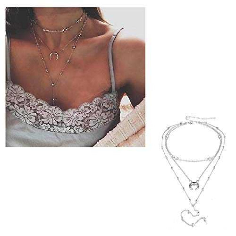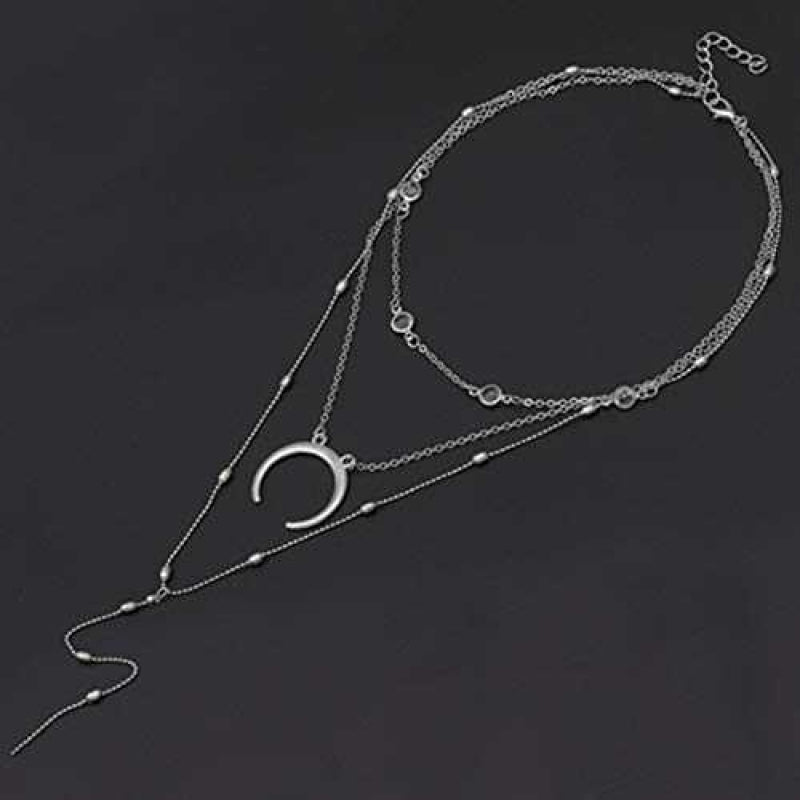 Elevate your style with our exquisite necklace, a celestial inspired piece that effortlessly blends elegance with a touch of mystique. This captivating necklace features a carefully crafted multi layered design, creating a dynamic and sophisticated look that will complement any outfit. The focal point of this stunning necklace is the crescent moon drop pendant, gracefully suspended at the center. The crescent moon design adds a celestial charm, symbolizing femininity, intuition, and the ever changing cycles of life. The pendant is meticulously detailed, capturing the ethereal beauty of the moon. Crafted with precision and care, the necklace boasts multiple layers of fine chains, each varying in length to create a harmonious and layered effect. The chains are expertly arranged to enhance the overall aesthetic, offering a chic and modern interpretation of classic jewelry. The lobster claw closure ensures a secure and comfortable fit, allowing you to wear this enchanting piece with confidence. The choice of closure not only adds functionality but also adds a touch of contemporary flair to the design. This necklace is the perfect accessory for both casual and formal occasions, effortlessly transitioning from day to night. Whether you are looking to make a subtle statement or seeking a bold fashion statement, necklace is a versatile and timeless piece that will undoubtedly become a cherished part of your jewelry collection. Embrace the celestial allure and express your unique style with this beautifully crafted necklace. Order yours today and let your jewelry speak volumes about your individuality and elegance.