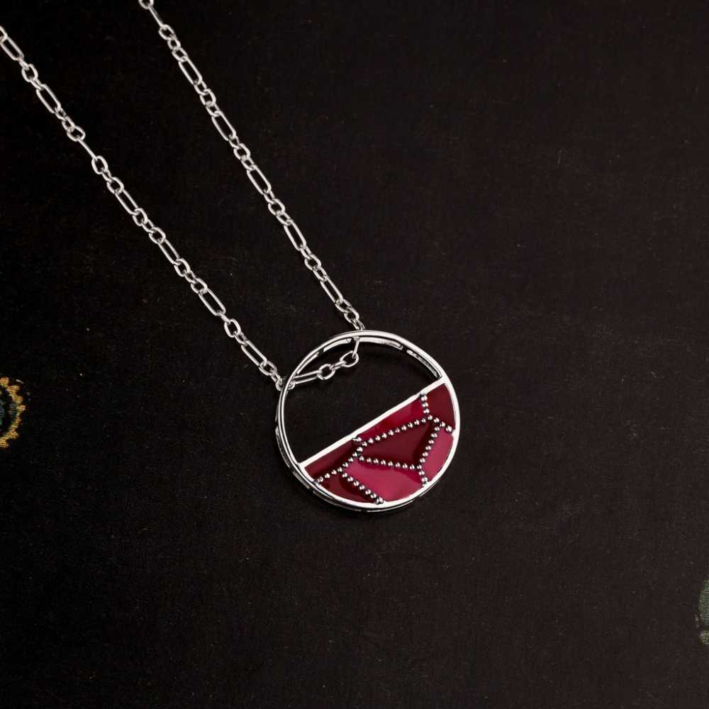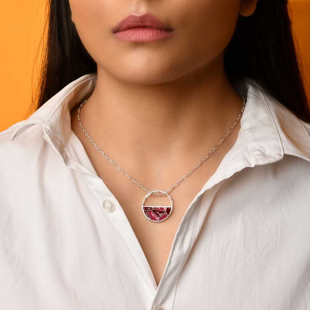 This silver plated metal pendant with a chain is circular in shape and half-filled with multihued enamel. The border of the enamel is highlighted with a dotted silver lining. This piece of jewellery is perfectly suitable for all occasions.