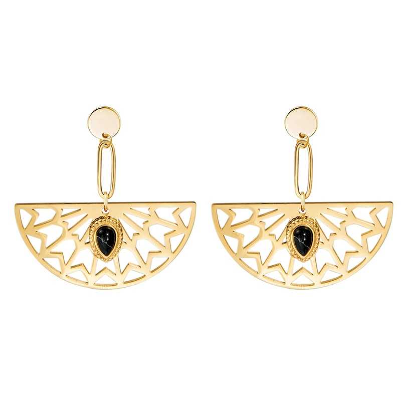 These elegant and striking earrings feature a hollow-out sector fan design drop that hangs on a link with a polished round stud top. A teardrop stone is given centre stage, within the half-circle for a subtle sparkle. These earrings present a simply chic design to enhance your everyday attire.