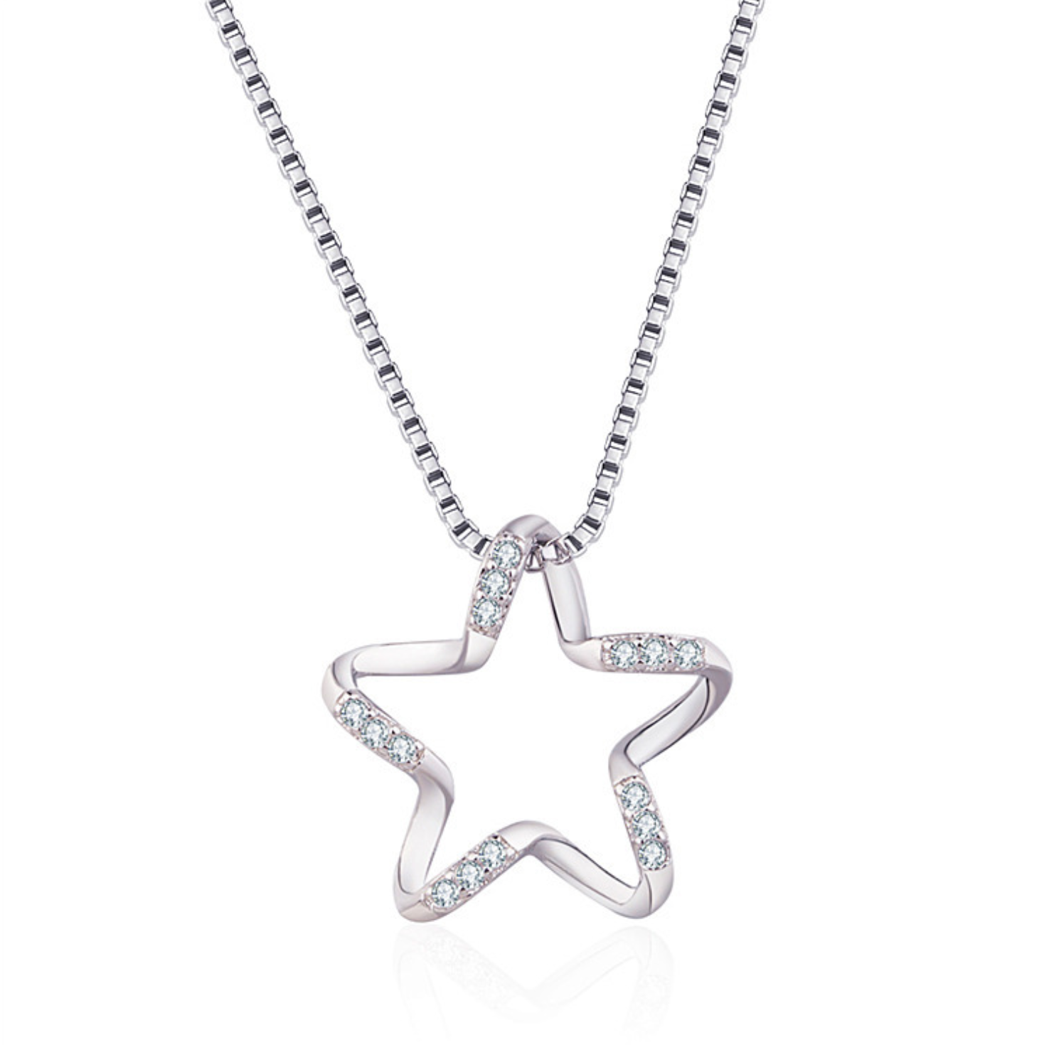 This silver plated star-winded pendant with chain is beautifully paved with cubic zirconia. The star design is eye-catching and suspends beautifully from a box chain. The pendant takes the shape of a mesmerizing star-winded design, evoking a sense of celestial wonder. The intricate detailing adds a touch of sophistication and captures the essence of the night sky. A celestial-inspired accessory that effortlessly combines the timeless elegance of silver plating with a touch of cosmic charm. This pendant necklace is designed to make a statement, featuring a unique star-winded design suspended from a long chain for a look that is both captivating and versatile. Crafted with a radiant silver-plated finish, the pendant exudes a classic and polished aesthetic. The silver plating not only enhances the pendant's visual appeal but also ensures durability and resistance to tarnishing. The pendant is elegantly suspended from a long chain, creating a flattering and elongated silhouette. The extended length adds a touch of drama to the necklace, making it a versatile accessory suitable for various necklines. The necklace features a secure clasp closure, providing both ease of wear and peace of mind. The closure ensures that the necklace stays in place, allowing you to showcase its celestial beauty with confidence. The long chain comes with an adjustable length, allowing you to customize the fit according to your preference and style. Presented in an elegant box, this necklace makes for a thoughtful and stylish gift for birthdays, anniversaries, or any special occasion.