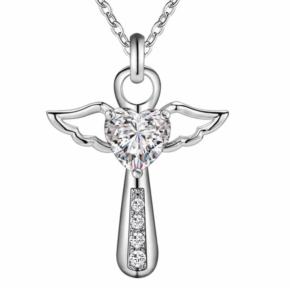 A dual design pendant with a religious cross and angel wings, placed with a heart-shaped zircon stone in the center is an expertly crafted piece and a significant reminder of strength, love, forgiveness, and hope. Ultra-chic and intricately fashioned, this piece hangs on a modern beaded link chain that adds even more texture. The shimmering shine of silver plated and cubic zirconia stones looks amazing next to your skin, and the necklace is placed at your throat, so it works well with any neckline you pick.