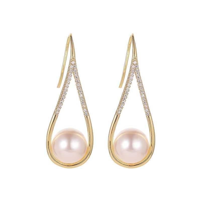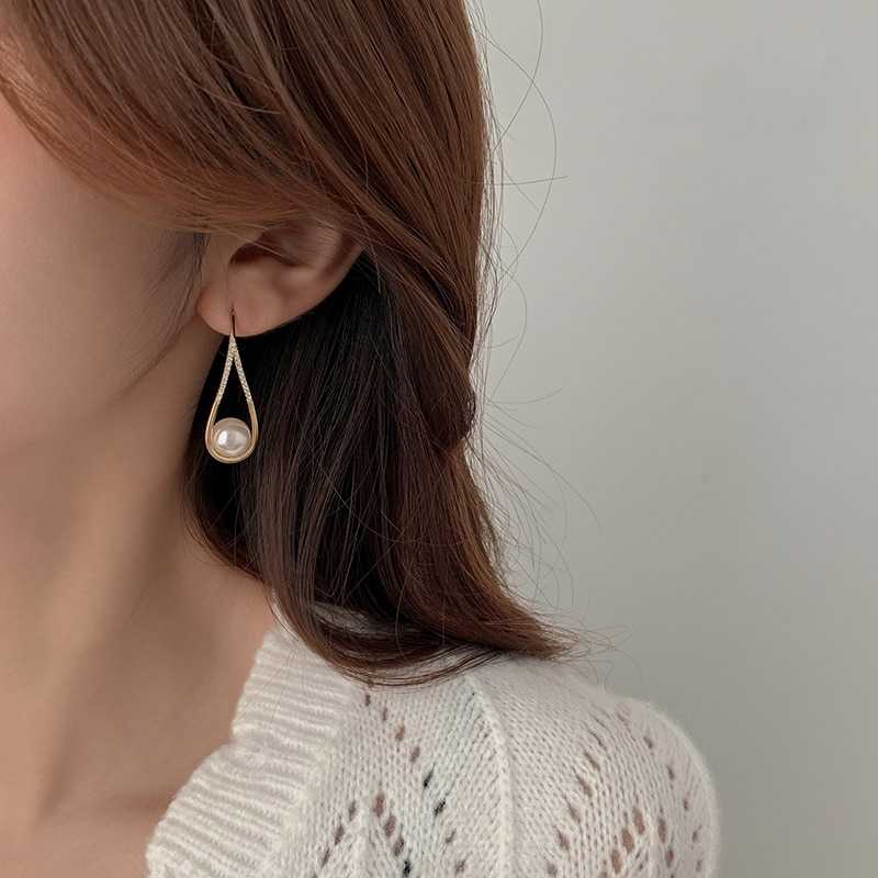 The tear drop shape of the pearl adds a touch of sophistication to the design, offering a graceful silhouette that complements various face shapes. Embedded around the pearl are zirconia stones, which mimic the brilliance of diamonds. These sparkling zirconia stones enhance the overall glamour of the earrings, adding a captivating shimmer and allure to the design. The hook style design of the earrings offers ease of wear, allowing them to gracefully dangle from the earlobes, creating movement and adding a sense of playfulness to the overall look. These tear drop pearl hook earrings with zirconia are versatile accessories that can effortlessly transition from day to night, making them suitable for various occasions, from casual outings to formal events.
