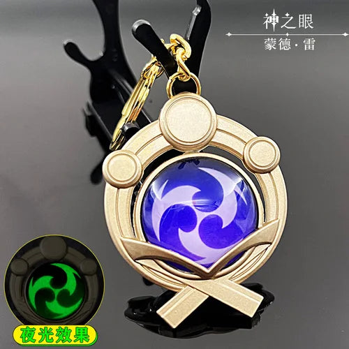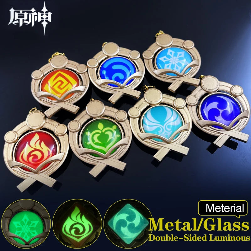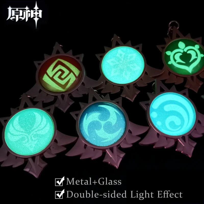 Collect this luminous keychain set featuring Vision holders like Lnazuma, Ganyu, Keqing, and more from the popular anime game Genshin Impact.