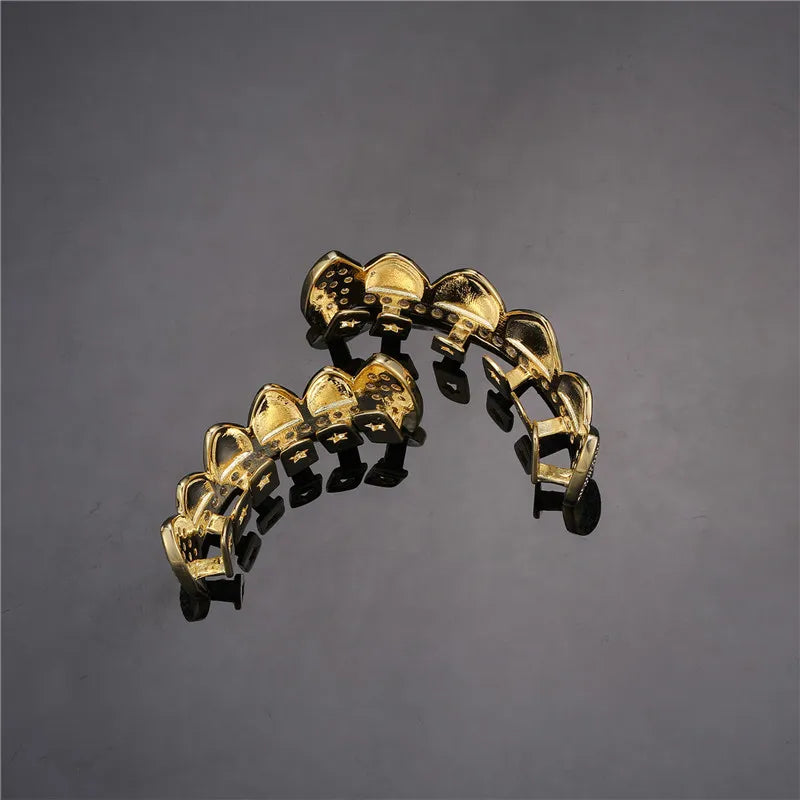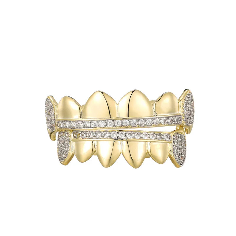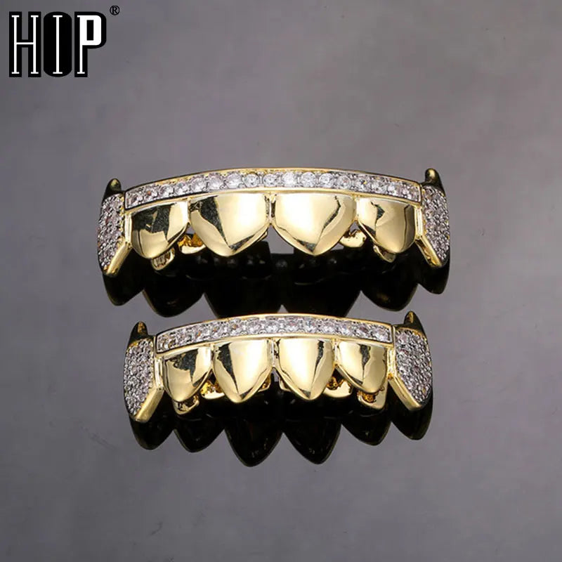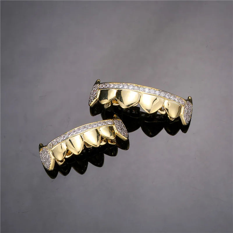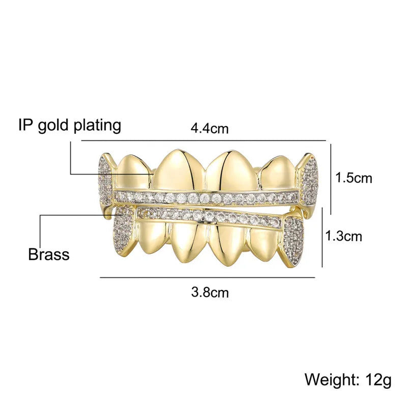 Upgrade your style with this set of hip hop bling teeth grillz featuring micro pave cubic zirconia top and bottom charms. Perfect for men and women.