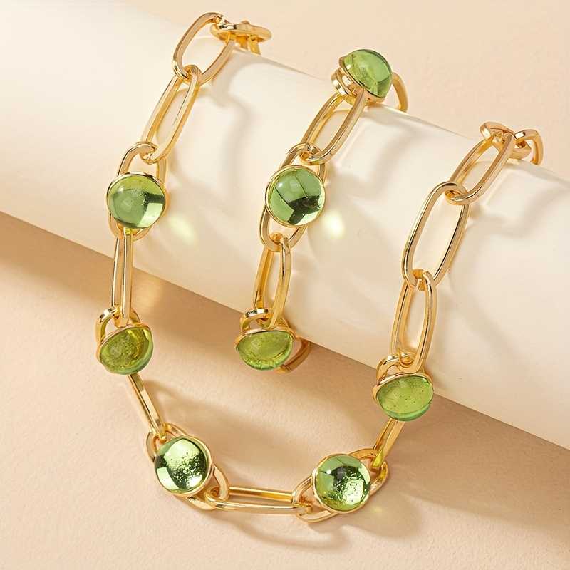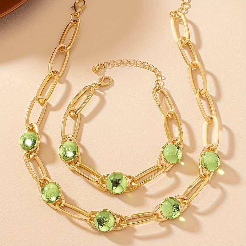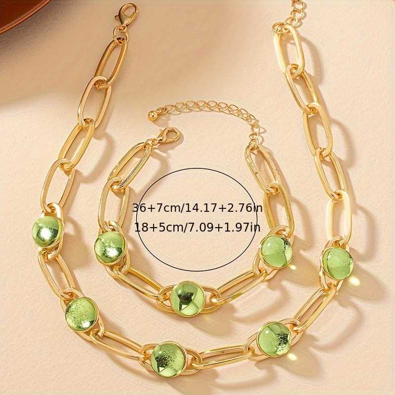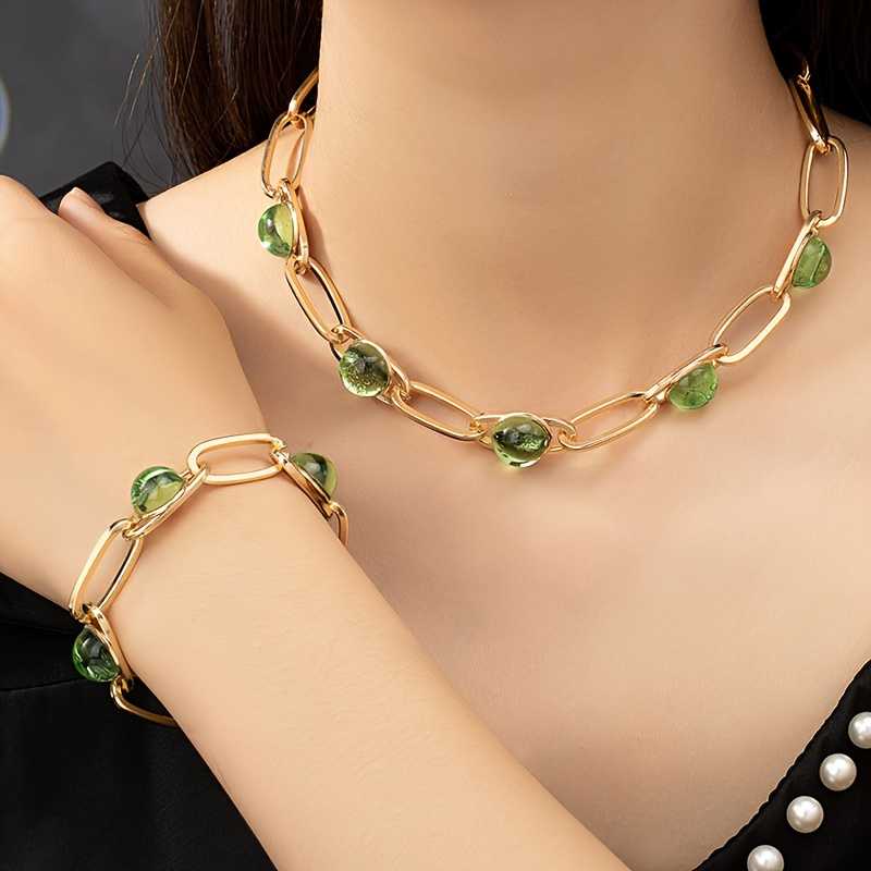 14k Gold Plated Necklace and Bracelet Set with Inlaid Green Waterish Glass
