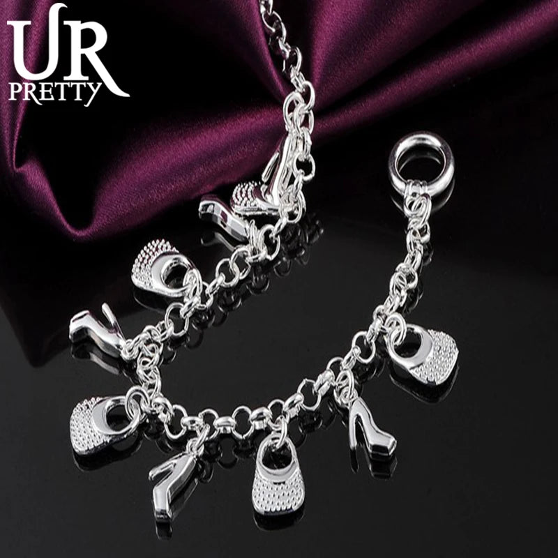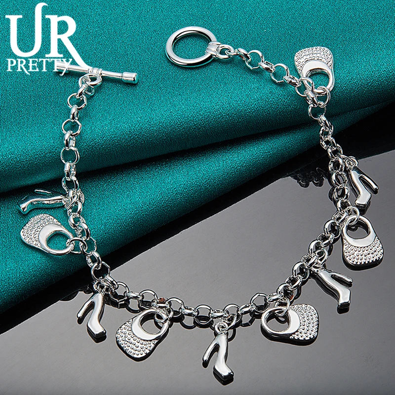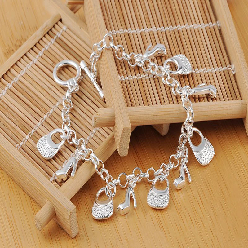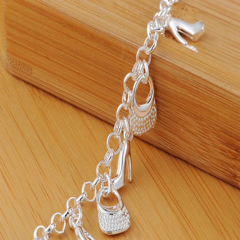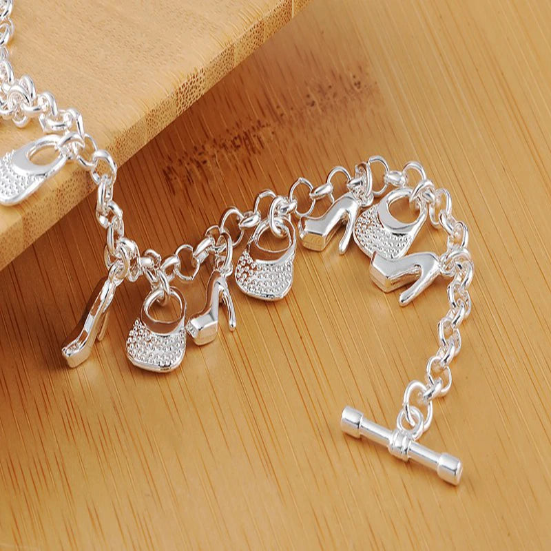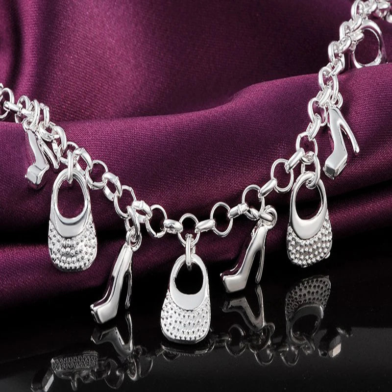 This elegant bracelet is made of 925 sterling silver and features a charming bag and high-heeled shoe design. Perfect for weddings, engagements, parties, and everyday wear.